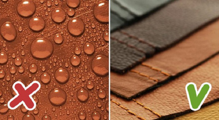 Độ thẩm thấu của sofa da bò thật rất tốt, vì vậy bạn có thể nhỏ một vài giọt nước lên ghế sofa để kiểm tra. Nếu các hạt nước lan rộng, thấm xuống bề mặt thì đó là sofa da thật. Nếu nước không thấm mà vẫn còn đọng thành giọt, thì đó là sofa giả da, do chúng được làm bằng nhựa tổng hợp hoàn toàn bị bịt kín không thấm nước.