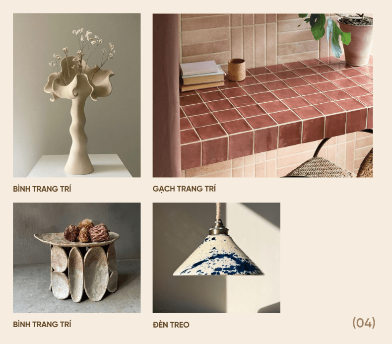 - Ngày nay: gốm được ứng dụng vào thiết kế nội thất hiện đại như gạch trang trí, lavabo, đèn treo nghệ thuật, bình phong, bình hoa décor. Các nghệ nhân cũng sáng tạo ra những bộ sưu tập gốm mang tính thẩm mỹ cao, vừa mang nét cổ điển vừa hiện đại.