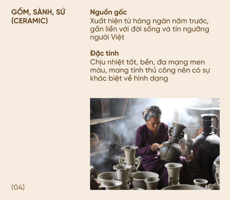 Gốm là kết tinh của đất – lửa – nước – bàn tay người thợ. Mỗi sản phẩm gốm, sành, sứ như lưu giữ “hồn đất Việt”, vừa gợi nhắc ký ức văn hóa, vừa tạo nên sự sang trọng và gần gũi cho không gian sống hiện đại.