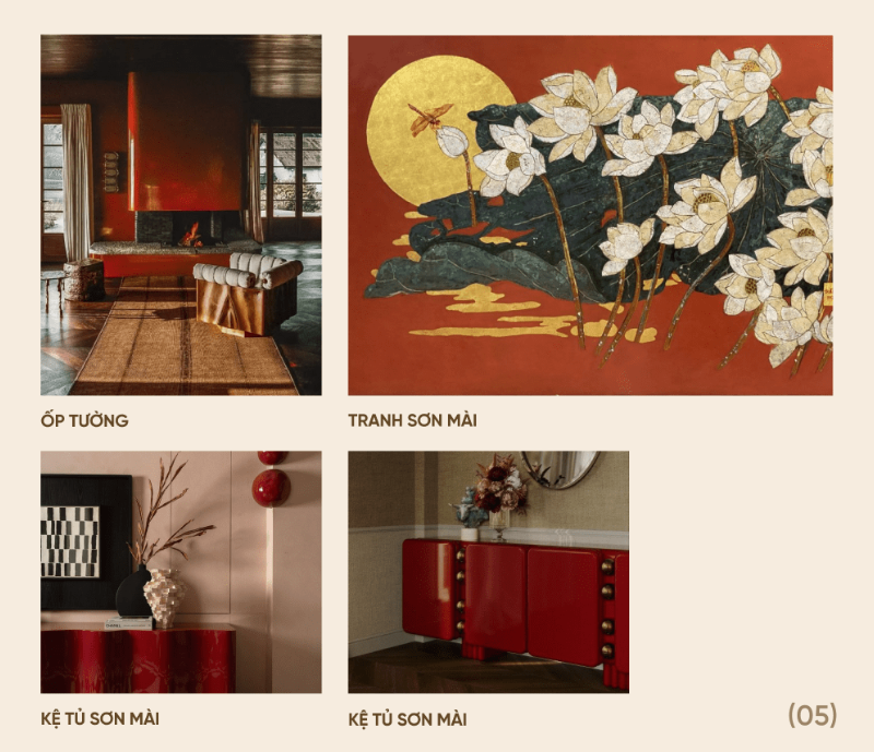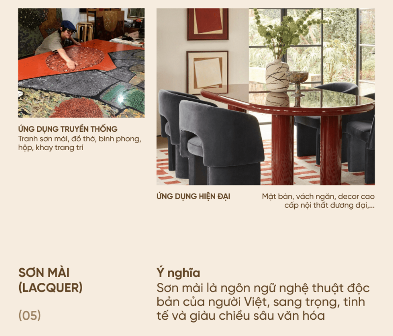 - Hiện đại: ứng dụng vào thiết kế nội thất đương đại như mặt bàn, vách ngăn, tranh décor, các món đồ décor cao cấp. Sơn mài còn trở thành biểu tượng nghệ thuật, được các nhà sưu tầm và không gian nghệ thuật ưa chuộng.