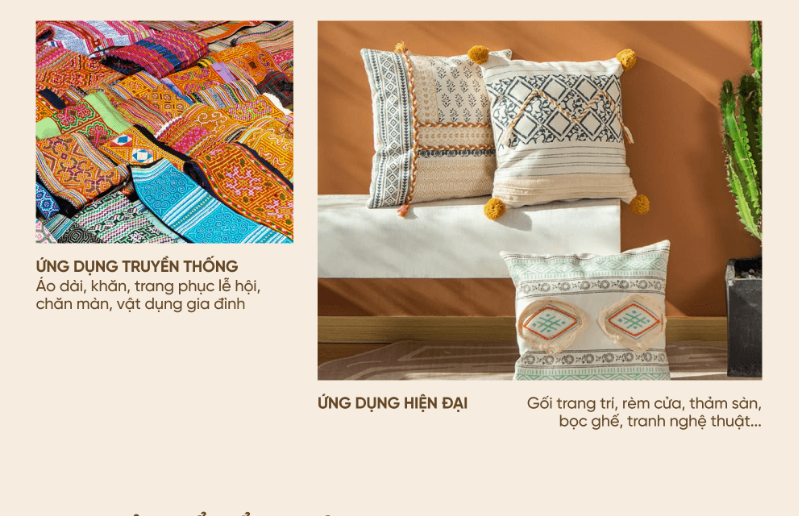 - Trong hiện đại: lụa và thổ cẩm được sử dụng rộng rãi trong décor nội thất: gối trang trí, rèm cửa, thảm sàn, bọc ghế, tranh nghệ thuật treo tường. Một số nhà thiết kế còn kết hợp chúng trong thời trang cao cấp, tạo nên sự giao thoa độc đáo giữa truyền thống và hiện đại.