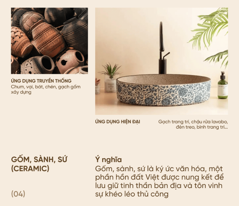 Trong dòng chảy văn hóa Việt, các chất liệu truyền thống không chỉ là phương tiện phục vụ sinh hoạt mà còn lưu giữ câu chuyện về đất, về người, về những giá trị đã tồn tại qua nhiều thế hệ. Từ chiếc chum đựng nước trong sân đình làng, tấm áo dài tha thướt trong ngày lễ hội, đến bức tranh sơn mài lấp lánh trên bàn thờ gia tiên, tất cả đều là minh chứng sống động cho sự khéo léo và sáng tạo của ông cha. Ngày nay, trong nhịp sống hiện đại, những chất liệu này đã và đang được “làm mới”, không mất đi hồn cốt truyền thống mà còn trở thành điểm nhấn tinh tế trong kiến trúc, nội thất và nghệ thuật đương đại. Bài viết sẽ cùng bạn khám phá ba chất liệu tiêu biểu: gốm – sành – sứ, sơn mài, lụa & vải thổ cẩm, qua hành trình từ truyền thống đến ứng dụng hiện đại.