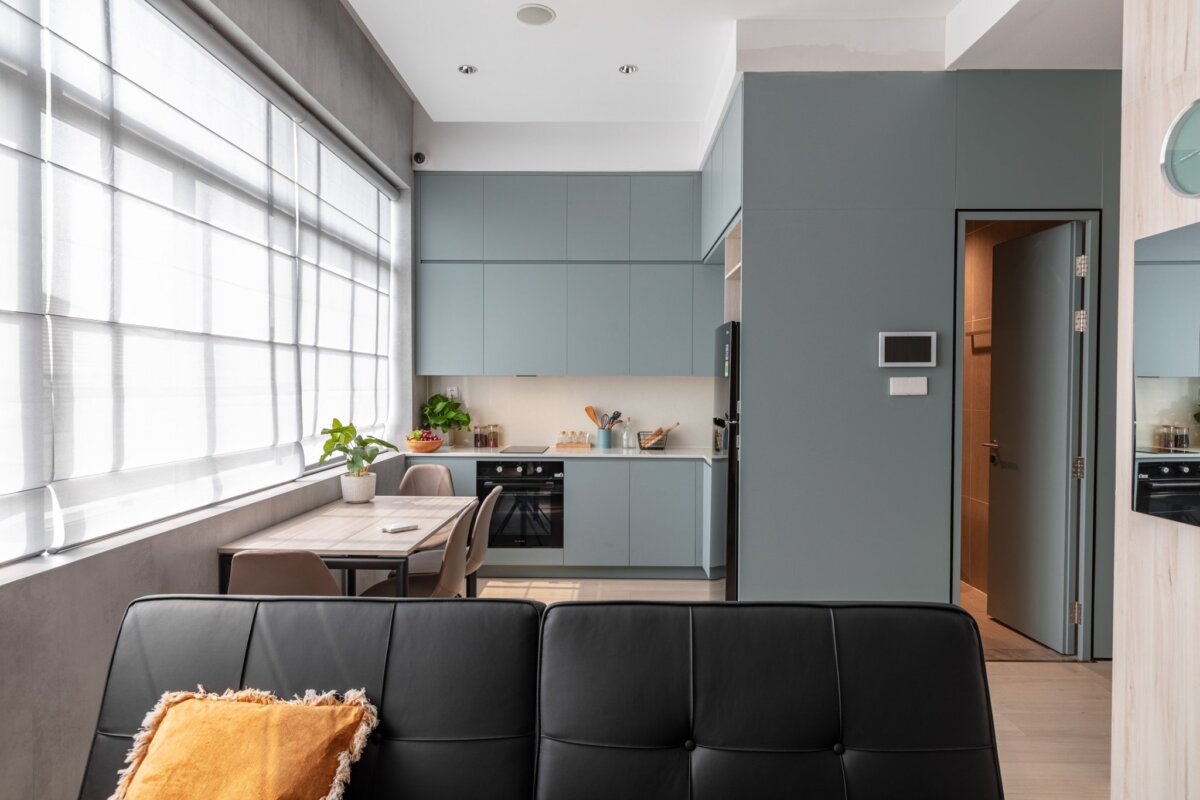 Đây là giải pháp vật lý đơn giản nhưng mang lại hiệu quả cao. Việc lắp đặt thêm một tấm ngăn, vách kính hoặc rèm cửa ở khu vực bếp gần sát với tường nhà vệ sinh sẽ tạo ra một “lá chắn” vô hình.
