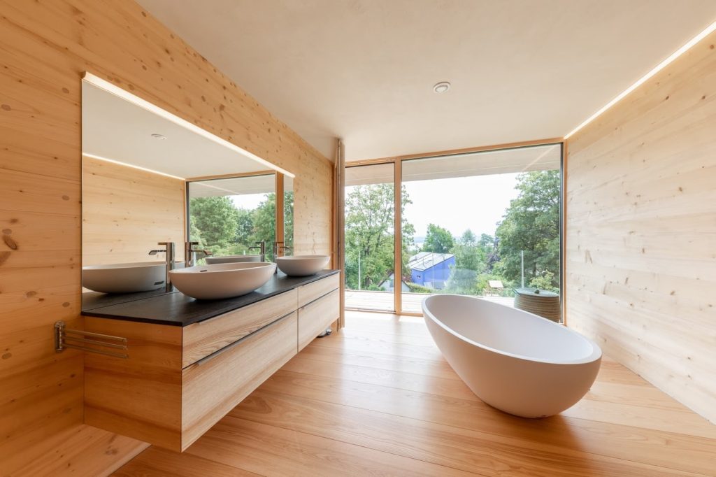 Kết cấu và màu sắc của gỗ giúp không gian nhà tắm trở nên dễ chịu, sang trọng và có tính kết nối hài hòa với phần còn lại của ngôi nhà. Đây là giải pháp hoàn hảo cho những ai yêu thích phong cách thiết kế đồng bộ, tinh tế.