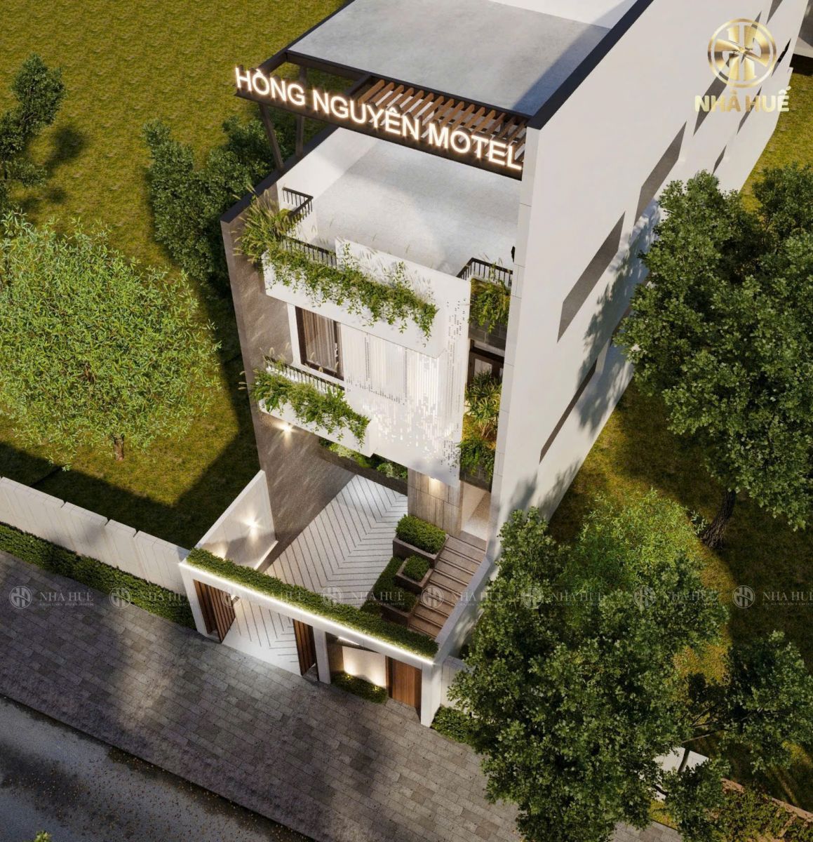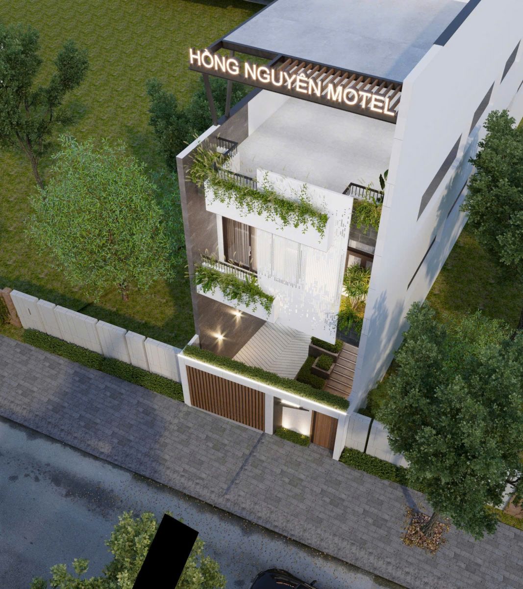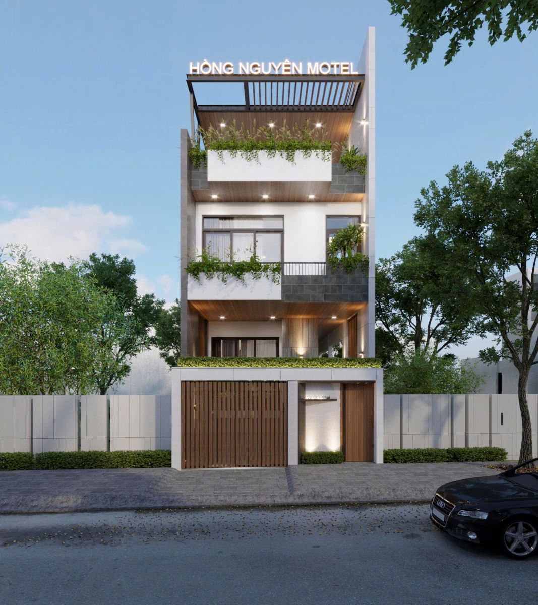 Đây là một thiết kế nhà phố/motel hiện đại, sang trọng và thông thoáng. Việc sử dụng vật liệu tương phản và tích hợp không gian xanh một cách khéo léo tạo nên một công trình có tính thẩm mỹ cao và rất thu hút.Công trình cho thấy sự tinh tế trong việc kết hợp vật liệu, ánh sáng và cây xanh. Thiết kế này tạo ra một mặt tiền có chiều sâu, vừa hiện đại, vừa thân thiện với thiên nhiên.