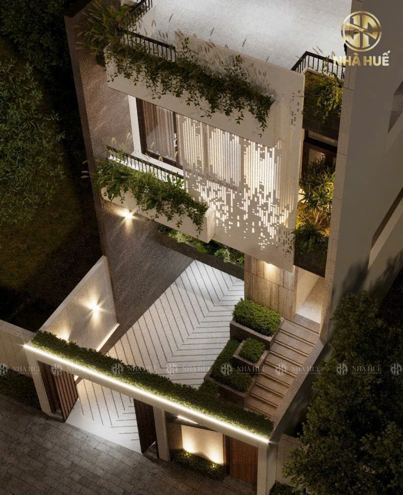 Tầng 3 & Sân thượng: Tầng 3 được thiết kế lùi vào trong, mặt tiền là một bồn cây xanh lớn. Sân thượng có giàn pergola (giàn lam) bằng kim loại màu đen, vừa để che nắng, treo cây xanh, vừa tạo thẩm mỹ.