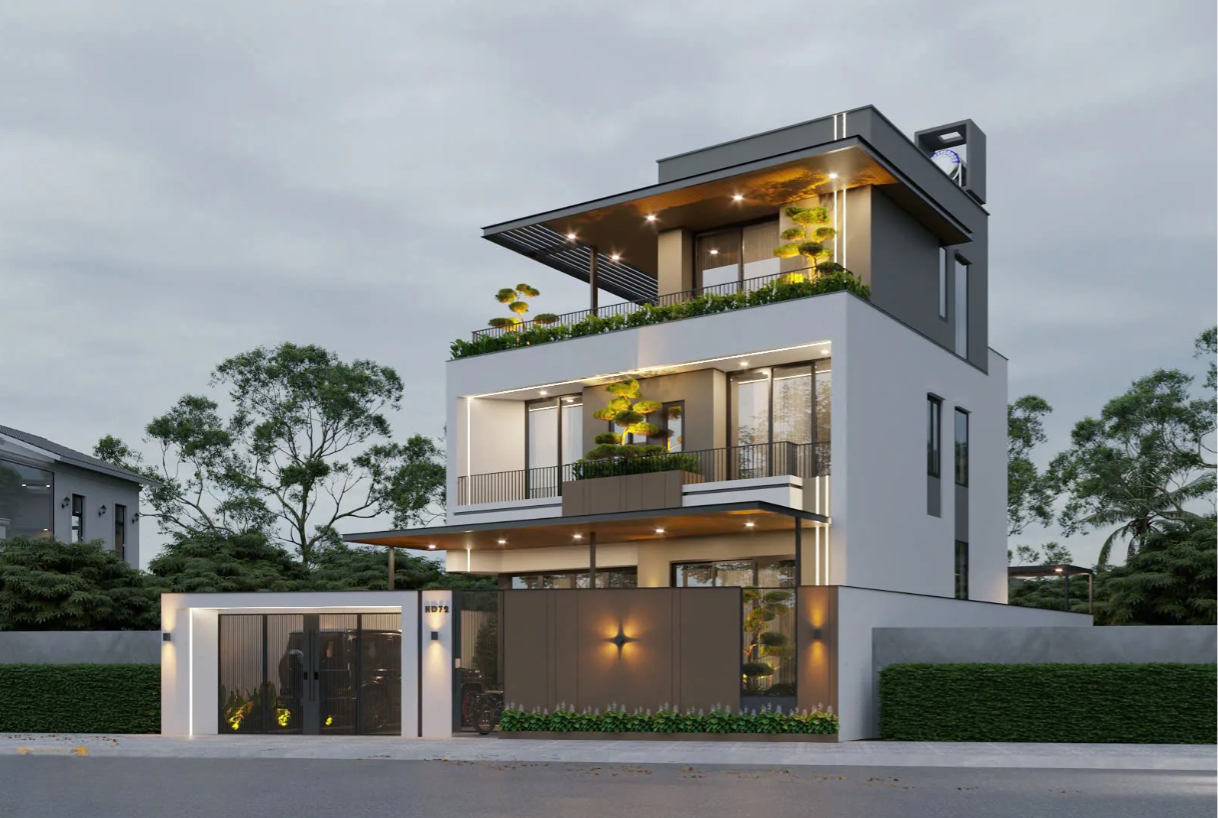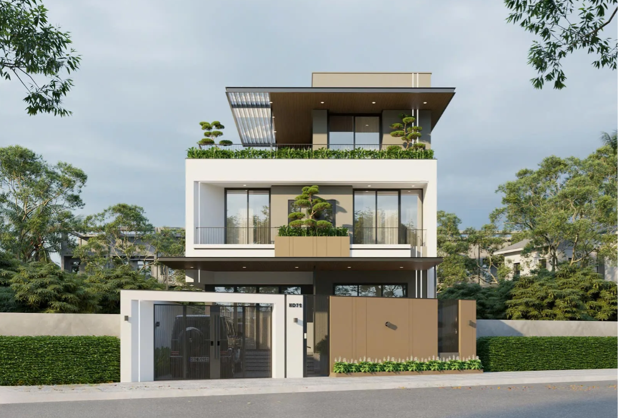 Màu sắc và vật liệu hiện đại: Tông màu chủ đạo là trắng - xám - nâu gỗ, một sự kết hợp quen thuộc trong kiến trúc hiện đại, mang lại cảm giác sang trọng, ấm cúng nhưng không kém phần trang nhã. Các vật liệu được sử dụng bao gồm:
