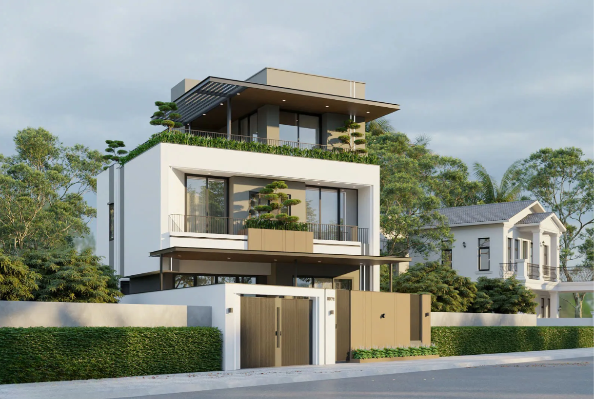 Hệ thống hàng rào cây xanh phía trước tạo sự riêng tư và một lớp lọc không khí tự nhiên.