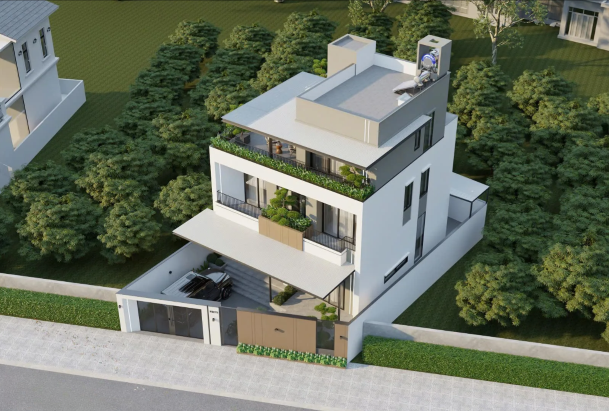 Công năng trên mái: Phần tầng tum trên cùng được bố trí gọn gàng để đặt các thiết bị kỹ thuật như bồn nước và hệ thống nước nóng năng lượng mặt trời, cho thấy sự tính toán kỹ lưỡng về mặt công năng và thẩm mỹ, giấu đi các chi tiết không cần thiết.