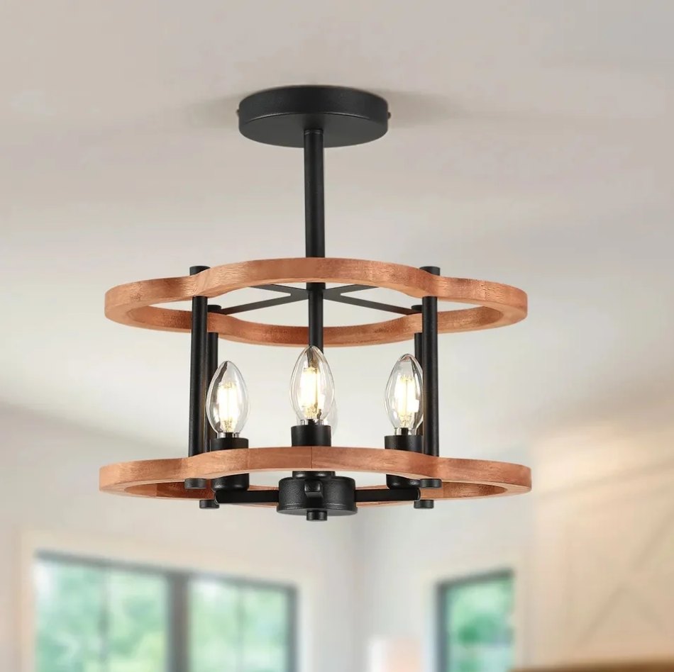 Chất liệu gỗ tự nhiên luôn mang đến cảm giác ấm áp, gần gũi và mộc mạc. Đèn thả khung gỗ có thể là những thanh gỗ xếp tầng, những khung gỗ đan xen hay một tấm gỗ nguyên khối khoét lỗ.