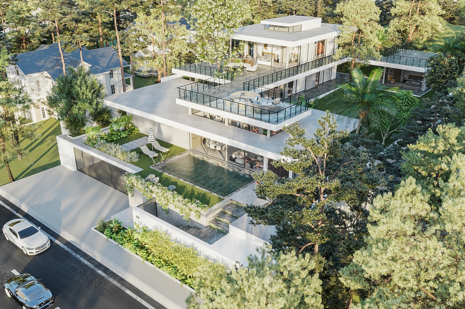 Đặc biệt, với những biệt thự diện tích lớn, việc bố trí cây theo tầng (cây cao – cây tầm trung – cây bụi) không chỉ đẹp về mặt thẩm mỹ mà còn tạo dòng khí lưu thông mạch lạc.