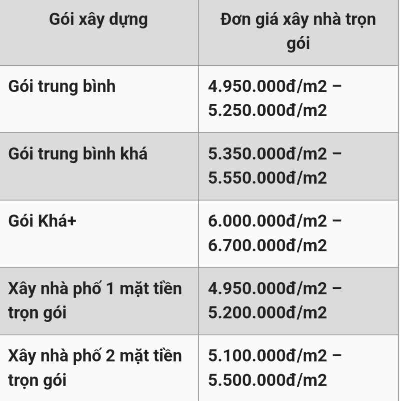 - Giá xây dựng phần thô gói khá: 3.300.000đ đến 3.500.000/m2.