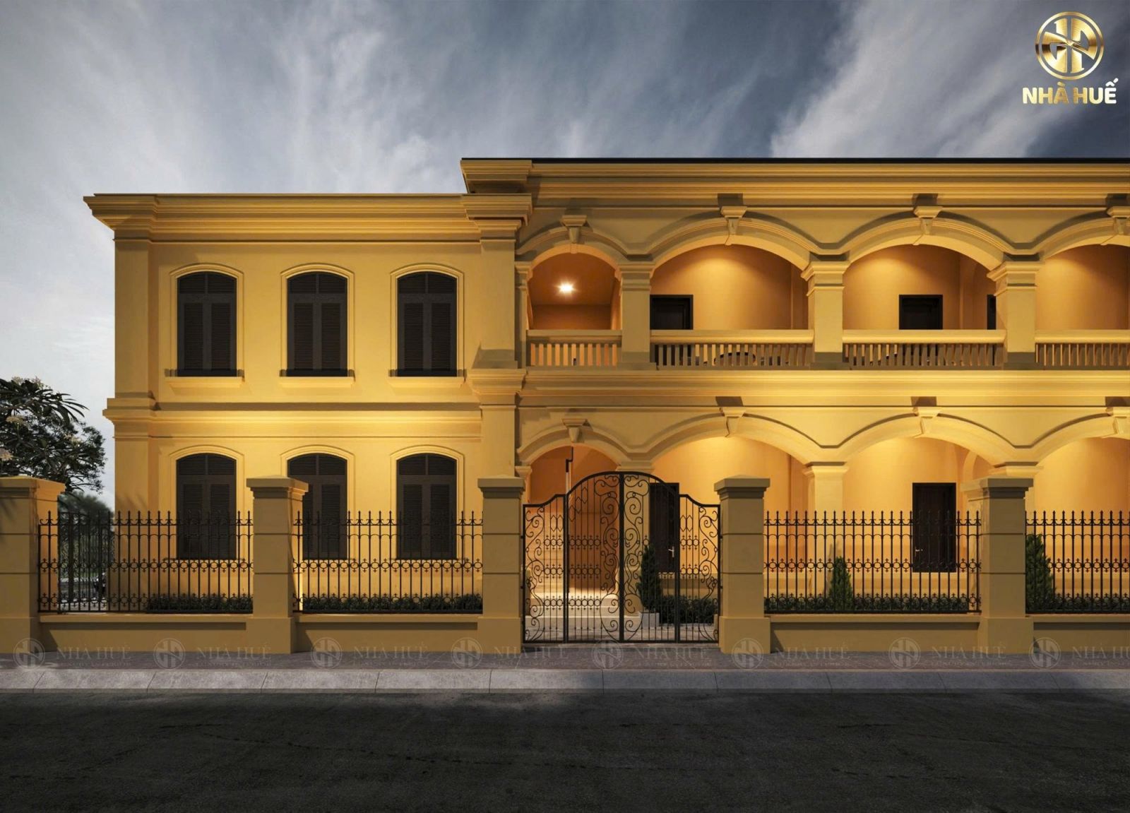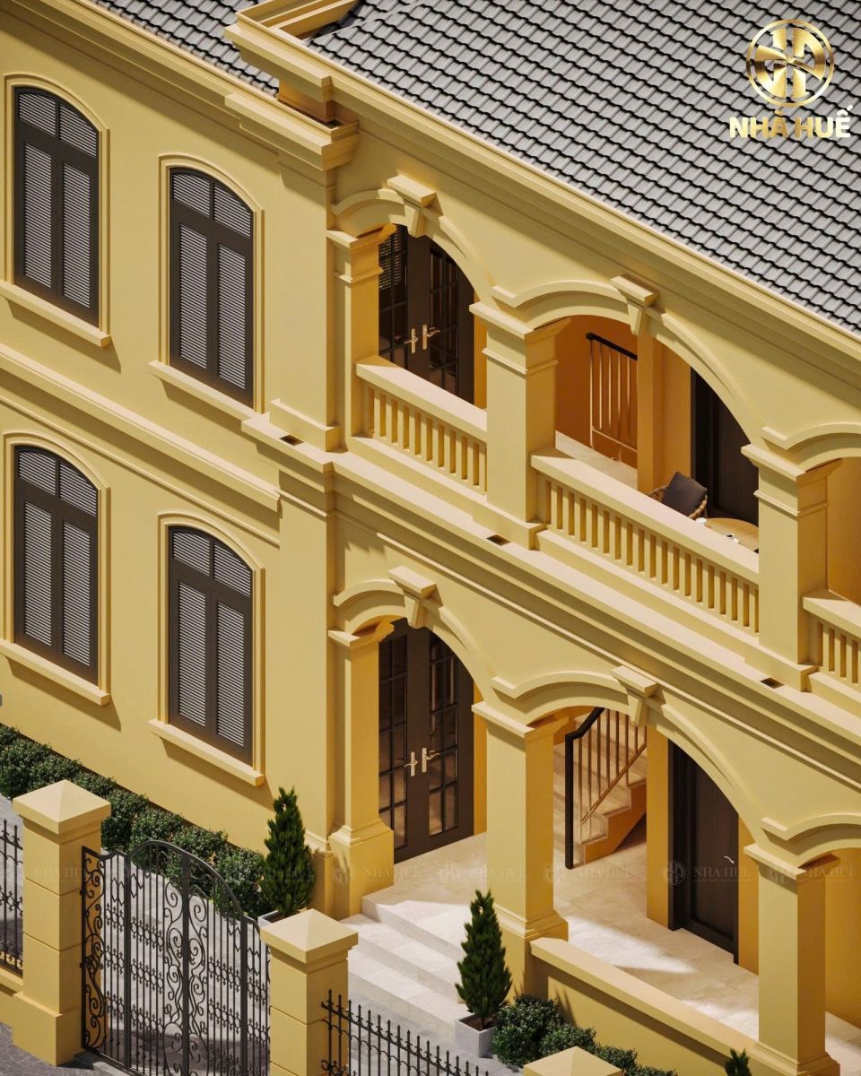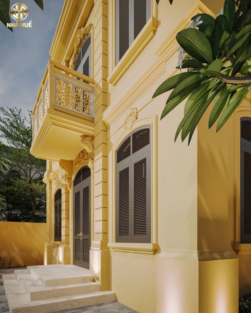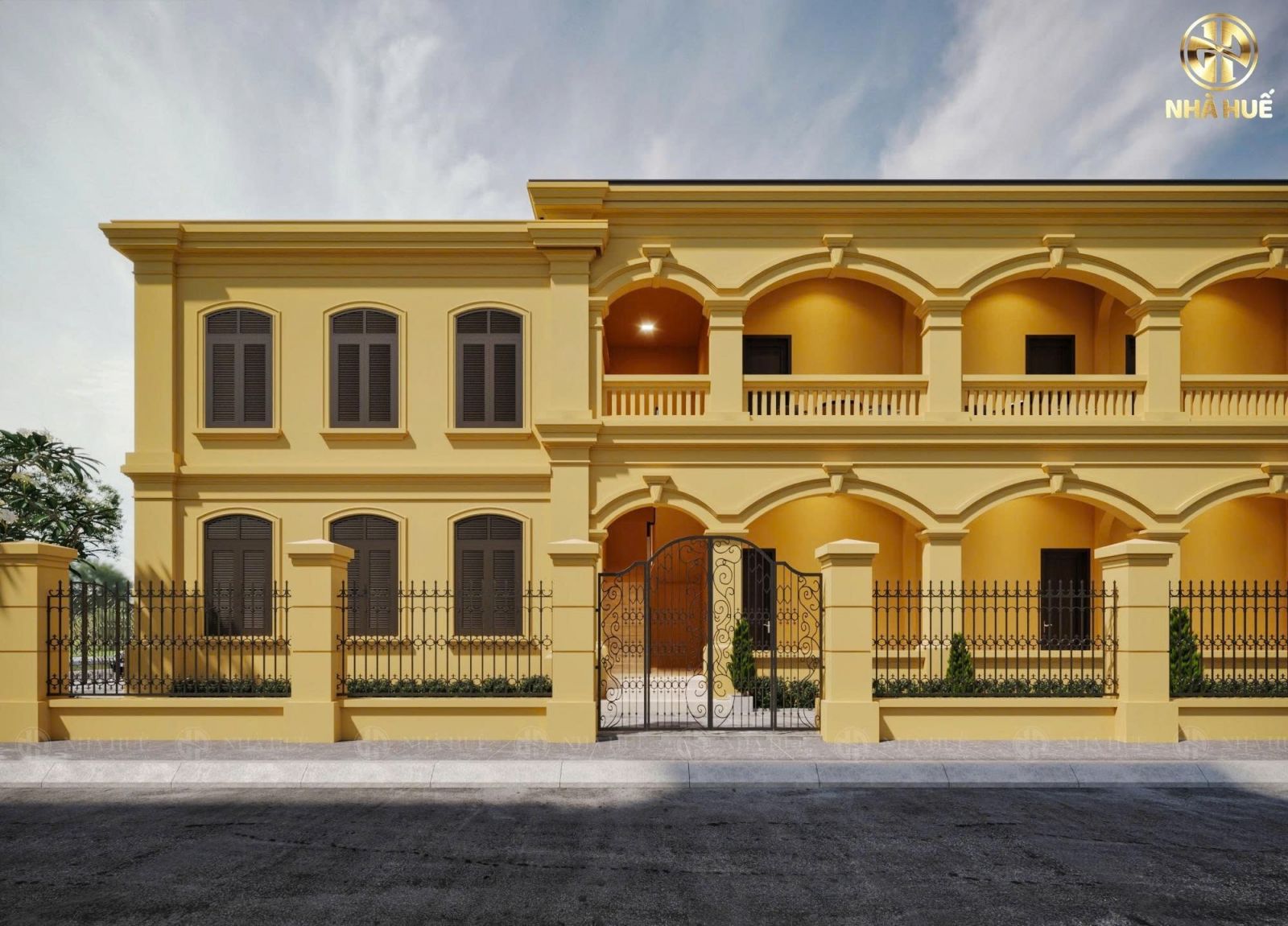 Màu sắc chủ đạo: Tông màu vàng nghệ ấm áp bao phủ toàn bộ mặt tiền, một màu sắc rất đặc trưng của kiến trúc Đông Dương. Màu vàng này kết hợp hài hòa với màu nâu sẫm của các ô cửa sổ và màu đen của hệ thống cổng, hàng rào sắt, tạo nên một tổng thể nổi bật nhưng không kém phần trang nhã.