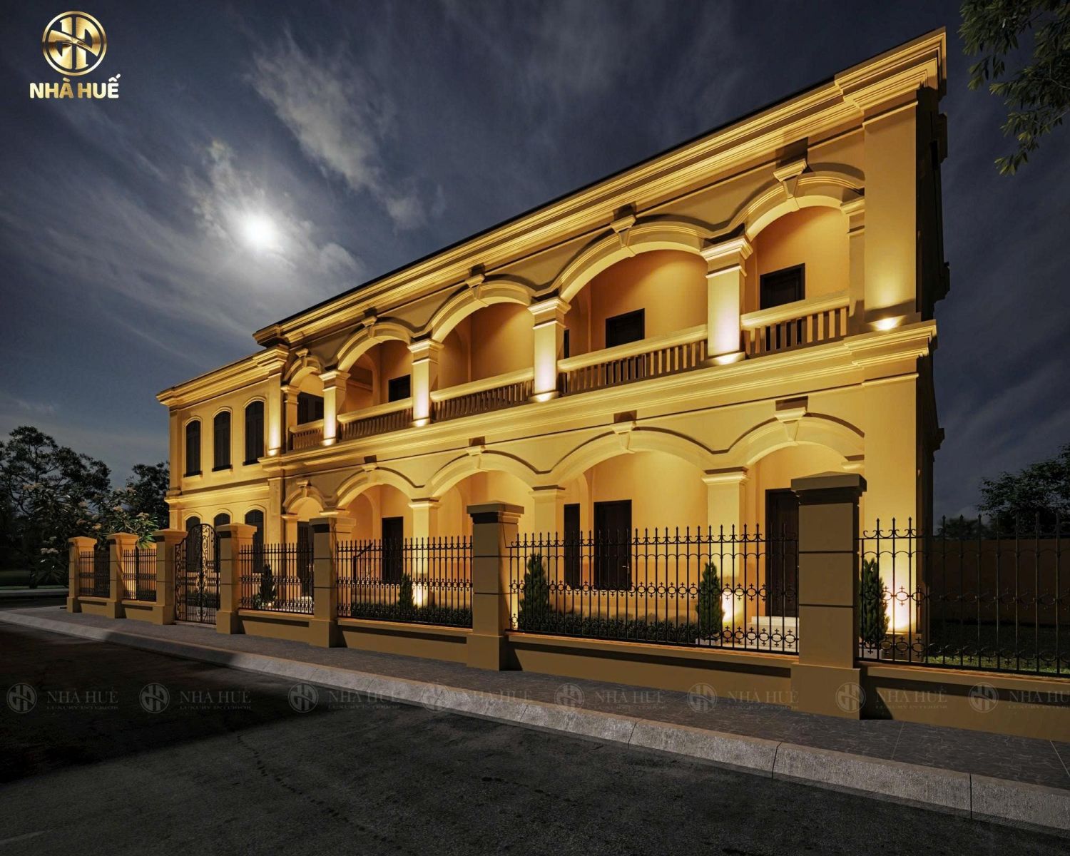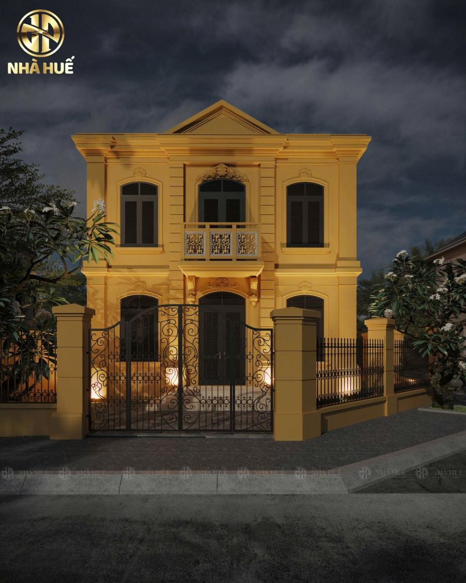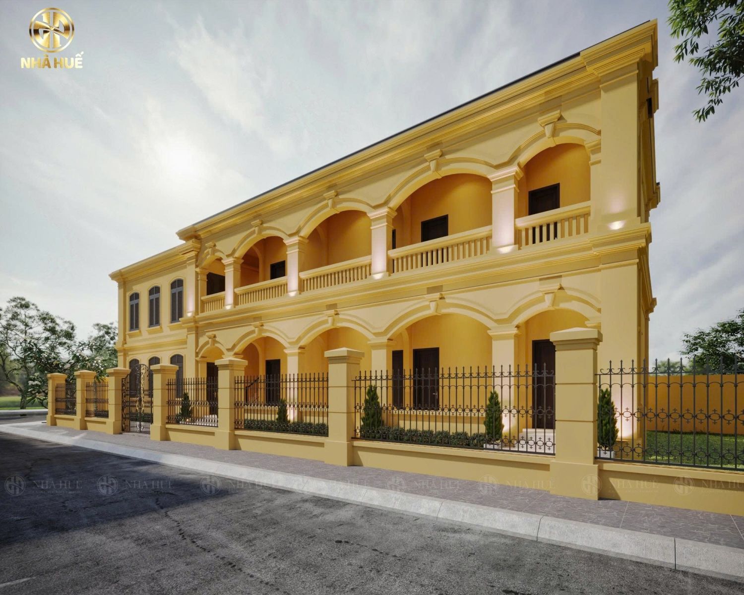 Màu sắc chủ đạo: Tông màu vàng nghệ ấm áp bao phủ toàn bộ mặt tiền, một màu sắc rất đặc trưng của kiến trúc Đông Dương. Màu vàng này kết hợp hài hòa với màu nâu sẫm của các ô cửa sổ và màu đen của hệ thống cổng, hàng rào sắt, tạo nên một tổng thể nổi bật nhưng không kém phần trang nhã.