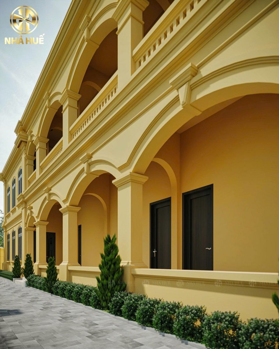 Điểm nhấn mái vòm: Điểm ấn tượng nhất của công trình là hệ thống các ô cửa và hành lang hình vòm liên tiếp ở cả hai tầng. Những đường cong mềm mại này không chỉ tạo chiều sâu, nhịp điệu cho mặt tiền mà còn mang lại cảm giác thông thoáng, sang trọng.