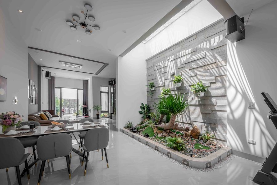 - Tạo một không gian sống thoải mái: Với khả năng lấy gió và ánh sáng tự nhiên cho căn nhà, ánh sáng từ giếng trời không chỉ làm cho không gian bên trong trở lên rộng rãi hơn mà còn giúp cung cấp nguồn năng lượng tích cực cho tình thần và sức khỏe của các thành viên trong gia đình.