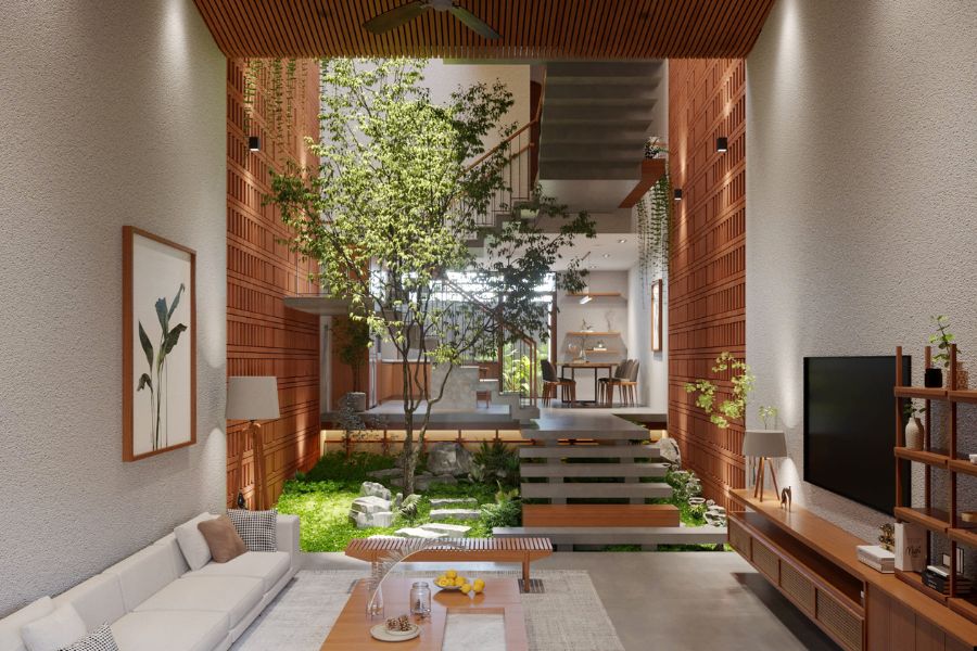 - Cải thiện chất lượng không khí: Giếng trời ngoài việc lấy ánh nắng tự nhiên, nó còn được sử dụng để lấy gió từ bên ngoài vào để giúp làm mát và lưu thông không khí bên trong căn nhà. Điều này giúp loại bỏ tốt mùi hôi, độ ẩm mang lại không gian sống trong lành cho ngôi nhà.