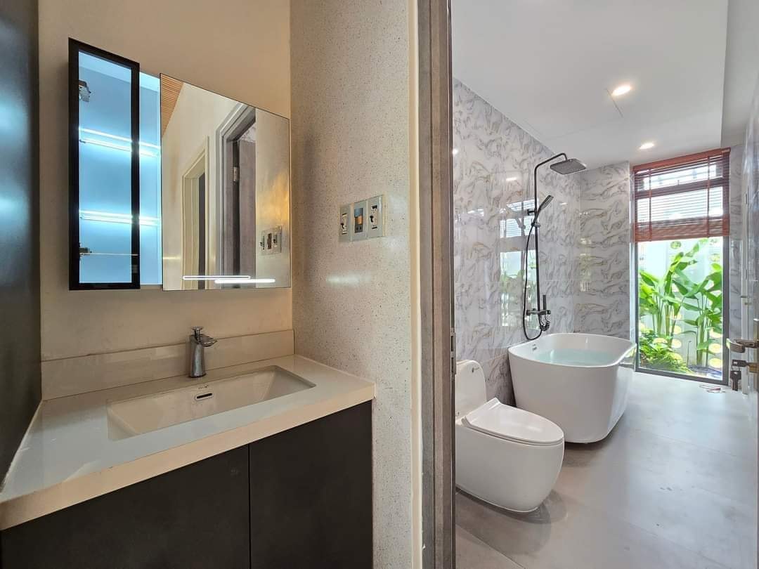 Khu vườn nhỏ xanh mát: Một phần không gian được dành để làm sân vườn với thảm cỏ xanh mướt và nhiều loại cây cảnh được trồng viền xung quanh. Mảng xanh này đóng vai trò như một lá phổi nhỏ, mang lại cảm giác tươi mát, trong lành và thư thái.
