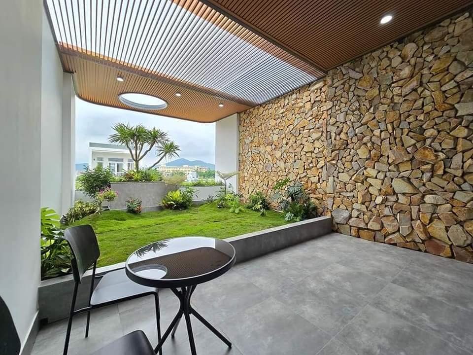 Sân thượng chính là nơi thư giãn lý tưởng, nơi con người có thể hòa mình vào thiên nhiên ngay trong chính ngôi nhà của mình. Sự kết hợp giữa sự vững chãi, thô mộc của đá, sự ấm áp của gỗ, và sự mềm mại, tươi mới của cây xanh đã tạo nên một không gian sống đầy cảm xúc và có giá trị thẩm mỹ cao.