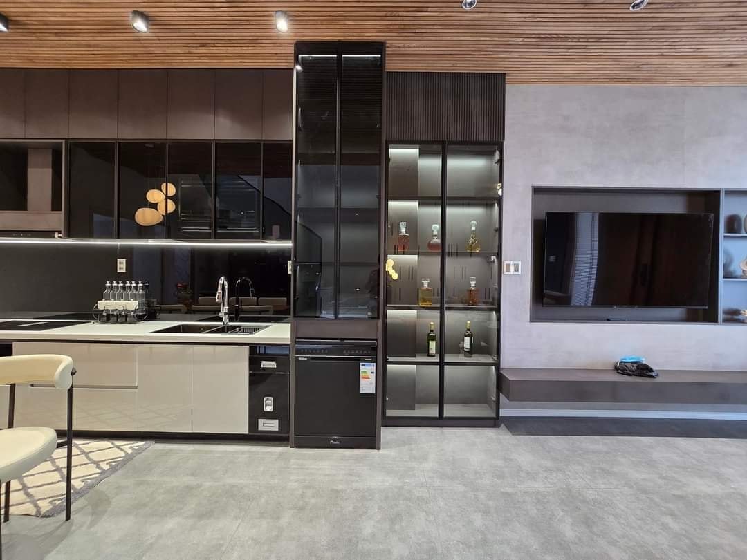 Tủ bếp trên sử dụng vật liệu màu đen bóng, trong khi tủ bếp dưới có màu xám nhạt, tạo sự tương phản đầy phong cách. Tường và mặt bếp cũng được ốp kính đen bóng, tạo sự đồng bộ và dễ dàng vệ sinh.