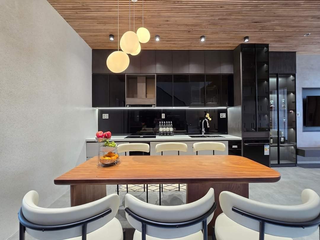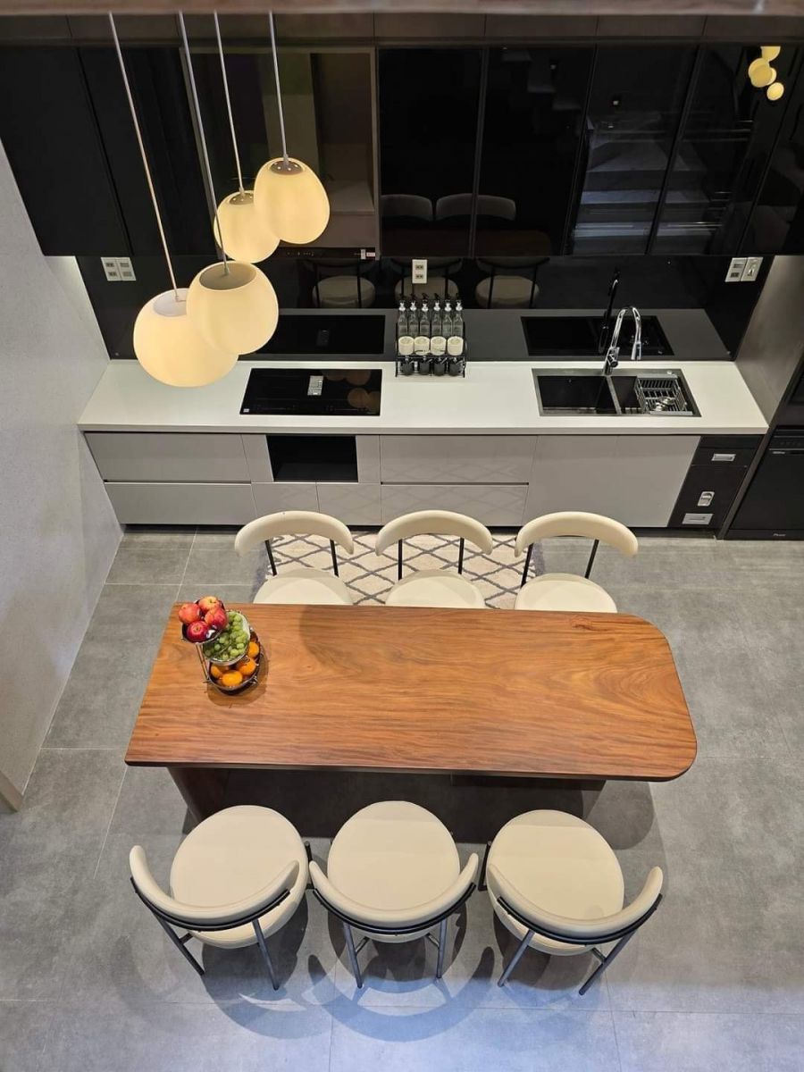 Bàn ăn: Bàn ăn bằng gỗ được đặt liền với đảo bếp, vừa là nơi ăn uống, vừa là không gian chuẩn bị đồ ăn tiện lợi.