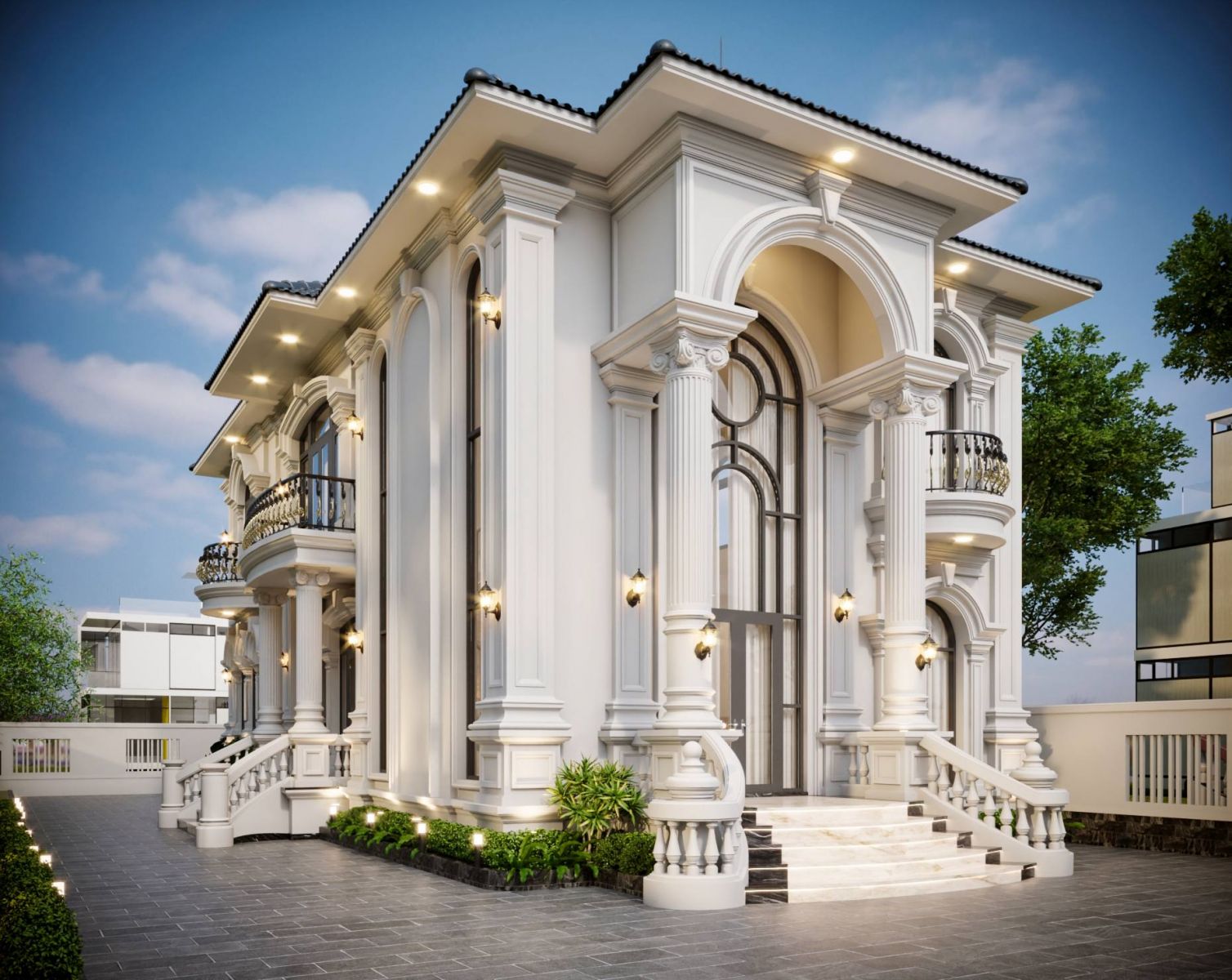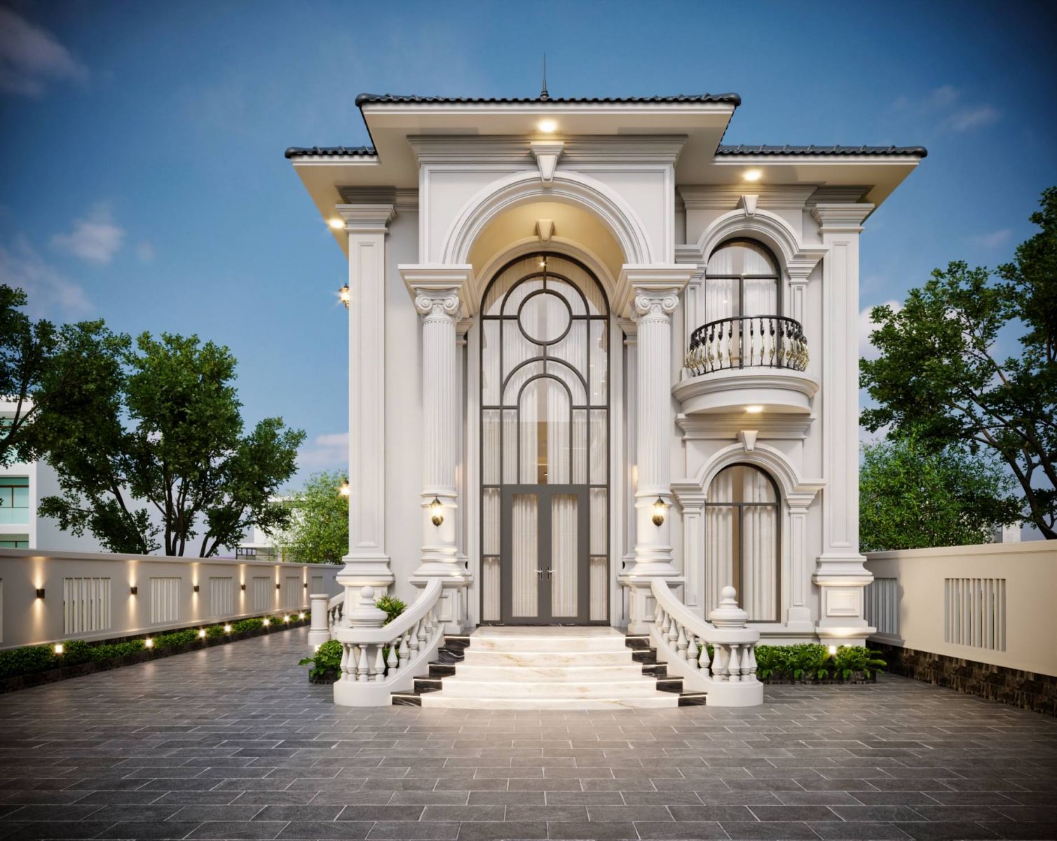 Ban công hình bán nguyệt ở tầng 2 với lan can sắt nghệ thuật uốn lượn tinh xảo, tạo điểm nhấn mềm mại cho công trình.Các đường phào chỉ chạy dọc thân cột và xung quanh các khung cửa được tối giản hóa nhưng vẫn đủ để tạo nên sự tinh tế.Tông màu trắng sứ chủ đạo kết hợp với màu đá ốp mặt sân xám trung tính, tạo nên vẻ ngoài thanh lịch và không bao giờ lỗi mốt.