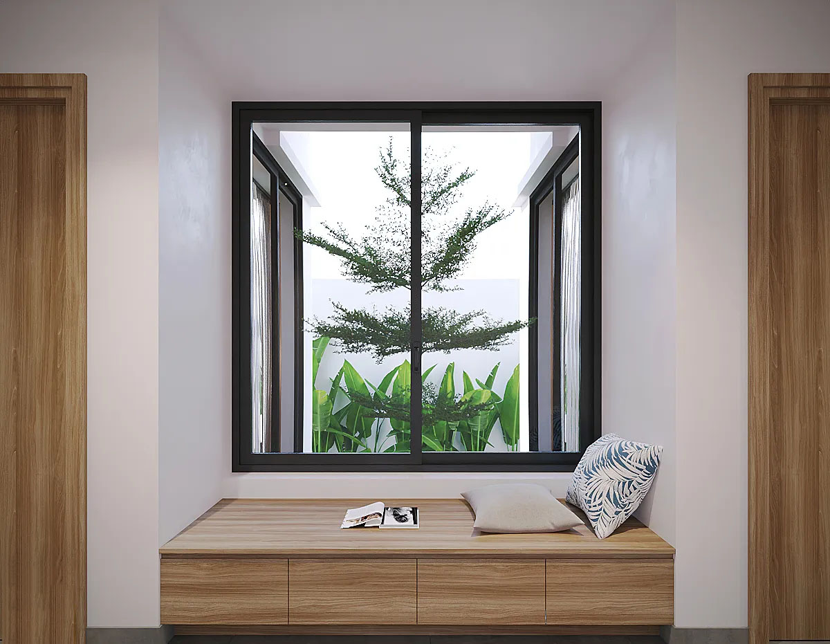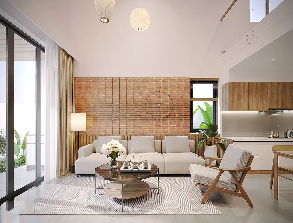 Nhà Huế đã sử dụng các vật liệu tự nhiên như gỗ sáng màu và đá, mang lại cảm giác ấm cúng, gần gũi, nhưng không kém phần sang trọng. Các chi tiết trang trí được tối giản, nhưng vẫn thể hiện rõ nét phong cách hiện đại với những đường nét vuông vức, mạnh mẽ, tạo nên một không gian vừa thanh thoát vừa dễ chịu.