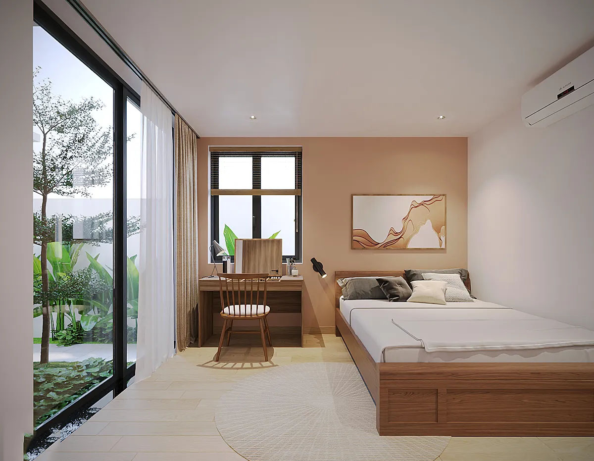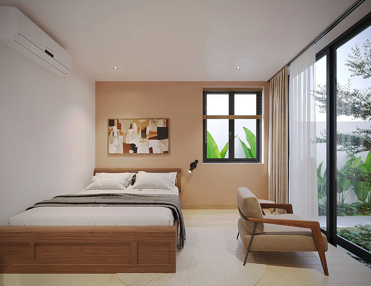 Phòng ngủ trong ngôi nhà hiện đại này được thiết kế với tinh thần tối giản, tạo nên một không gian yên tĩnh và thư giãn tuyệt vời. Với sự kết hợp giữa màu sắc nhẹ nhàng như tông màu be và cam pastel, phòng ngủ không chỉ mang đến cảm giác ấm áp mà còn giúp tạo ra một bầu không khí nhẹ nhàng, dễ chịu.