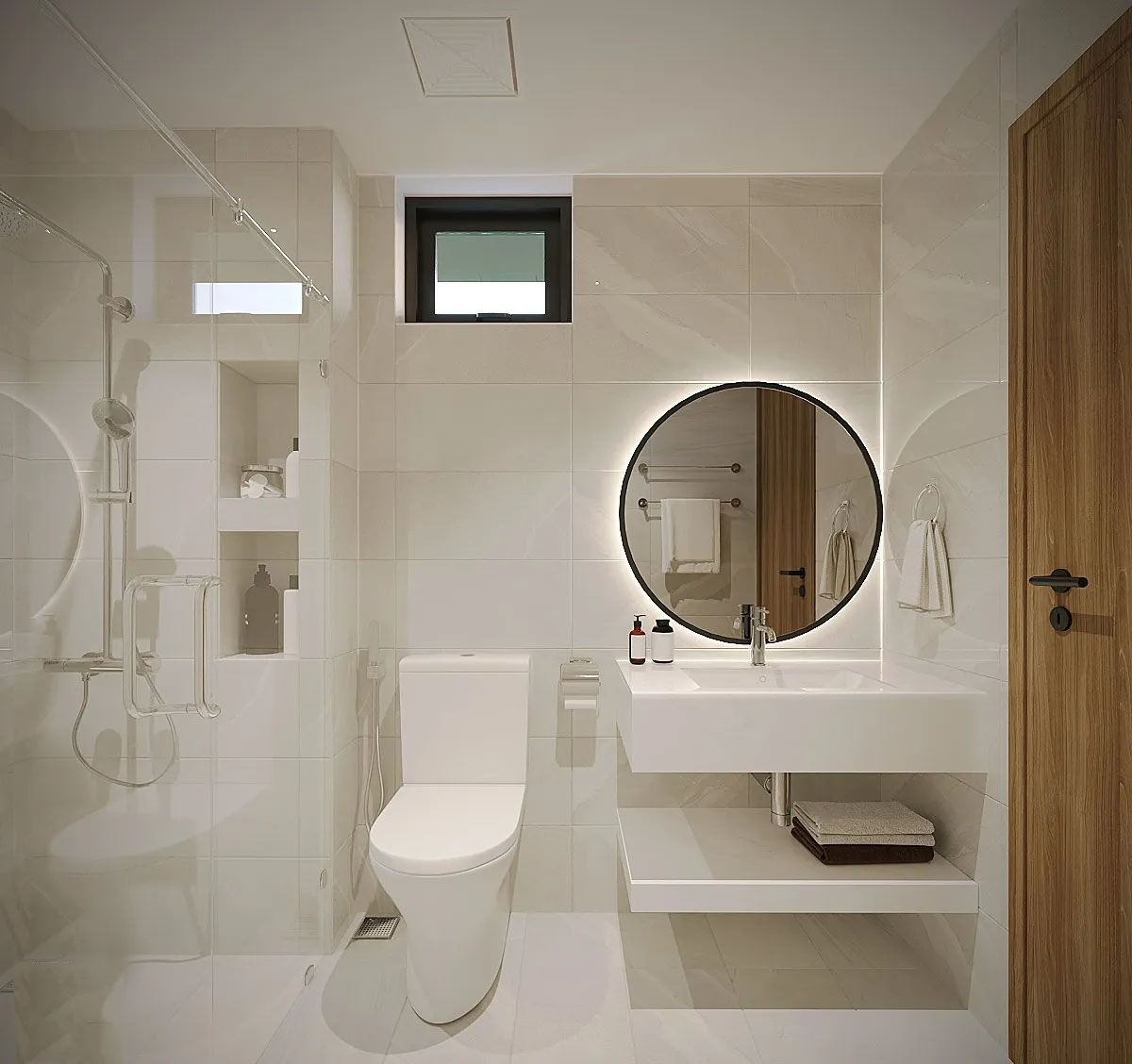 Mỗi chi tiết trong phòng đều được chú trọng về công năng sử dụng, từ chiếc ghế thư giãn góc phòng đến kệ bàn làm việc nhỏ gọn nhưng đầy đủ tiện nghi. Đèn bàn và đèn chiếu sáng âm trần mang đến ánh sáng mềm mại, hoàn hảo cho những khoảnh khắc thư giãn hay làm việc.