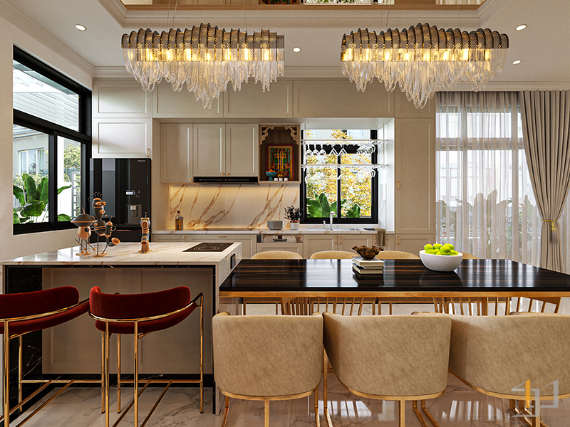 Chất liệu da tự nhiên cũng không thể thiếu trong nội thất tân cổ điển. Những bộ sofa bọc da cao cấp, ghế ăn bọc nệm mềm mại không chỉ tạo cảm giác êm ái, thoải mái mà còn góp phần làm tăng thêm sự sang trọng. Để tạo điểm nhấn, các chi tiết kim loại như tay nắm cửa, chân bàn ghế, đèn chùm thường được mạ vàng hoặc đồng, giúp tôn lên vẻ xa hoa, quyền quý cho toàn bộ không gian biệt thự.