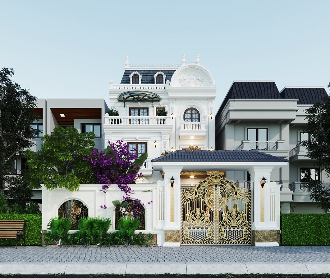 Đặc trưng bởi những đường nét mềm mại, cột trụ đối xứng, mái vòm và hoa văn trang trí tinh xảo,phong cách tân cổ điển thể hiện sự đẳng cấp và quyền lực. Thường được các gia chủ thành đạt, yêu thích sự bề thế lựa chọn.