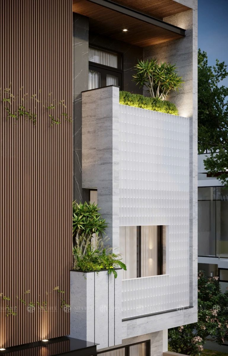 - Lam chắn nắng (brise-soleil): Là một trong những giải pháp “kinh điển” nhưng hiệu quả cao. Có thể dùng lam bê tông, lam gỗ nhựa ngoài trời hoặc kim loại sơn tĩnh điện, bố trí dọc theo hướng Tây hoặc làm dàn lam kết hợp với cây leo. Giải pháp này không chỉ cản nắng mà còn tạo hiệu ứng đổ bóng rất đẹp trên mặt tiền.