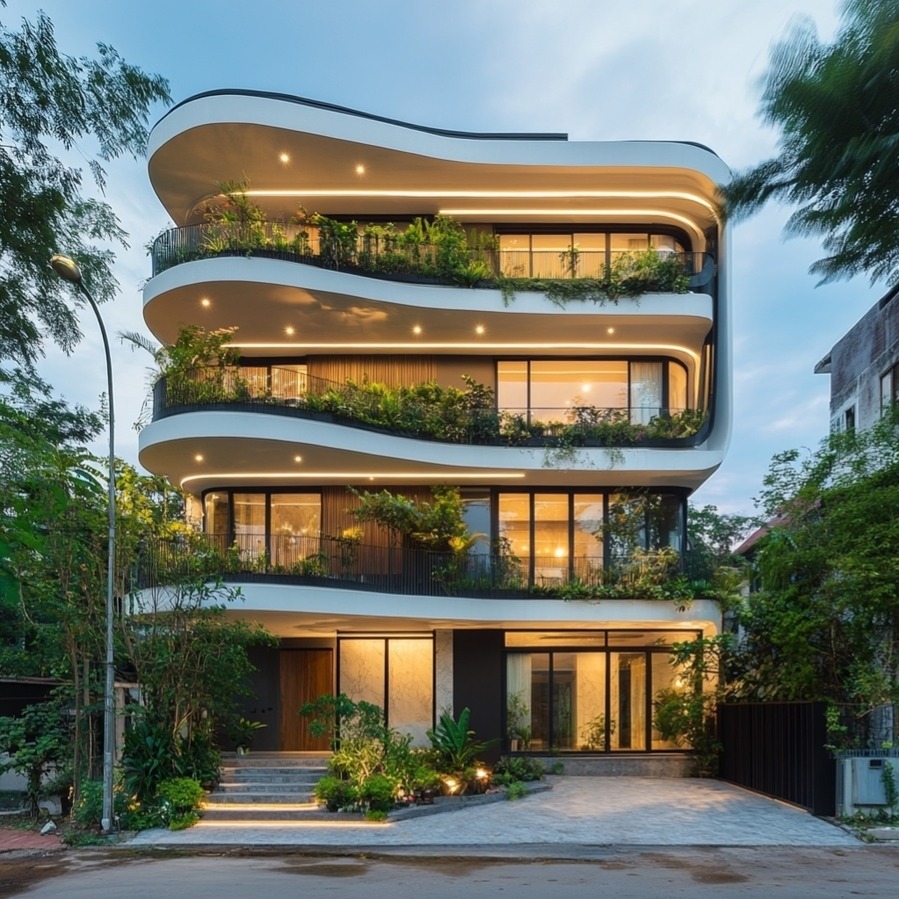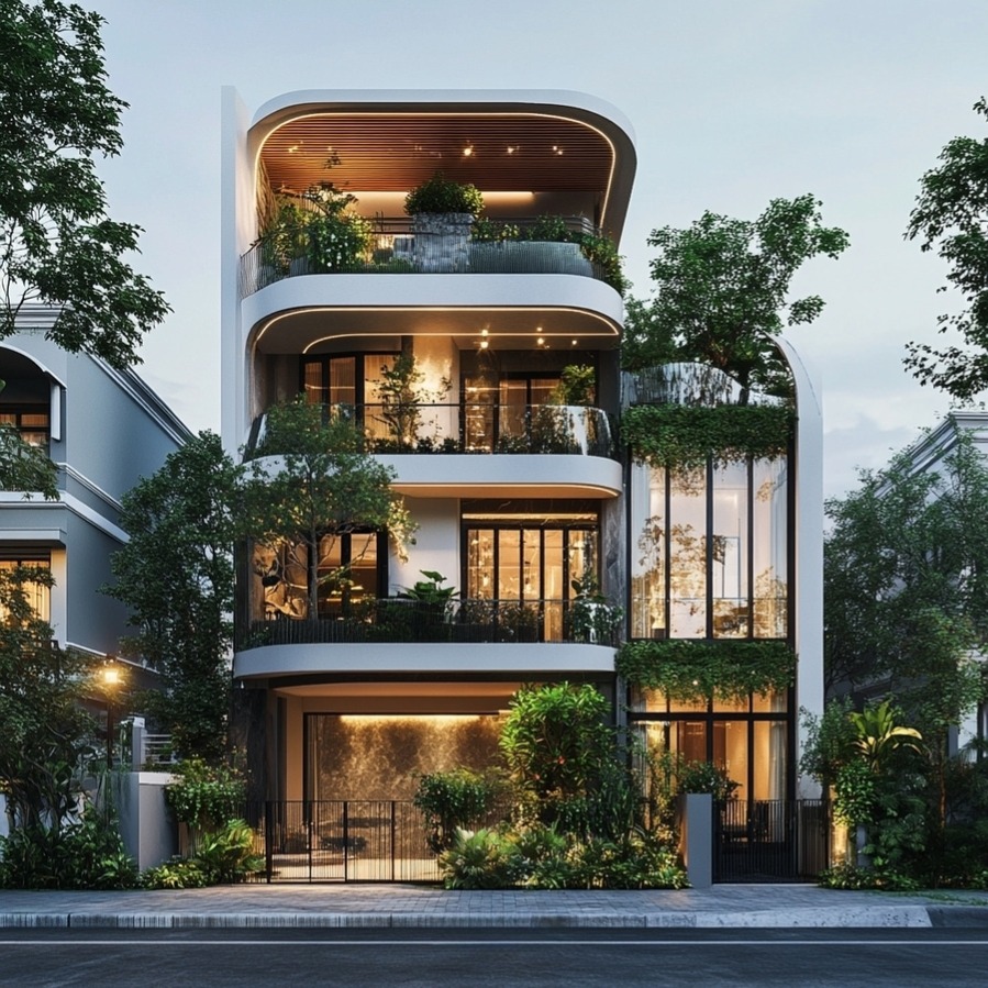 Nhà Huế chia sẻ những mẫu biệt thự 4 tầng hiện đại với thiết kế phá cách, ấn tượng hứa hẹn sẽ mang đến một trải nghiệm sống hoàn toàn khác biệt cho gia chủ. Bằng thủ thuật sử dụng những đường cong mềm mại, uyển chuyển kết hợp cùng các khối hình học mạnh mẽ, thiết kế mang đến một tổng thể vừa hiện đại vừa nghệ thuật. Bên cạnh đó, hệ thống cửa kính lớn và mảng xanh bao quanh có tác dụng mang đến một không gian sống hài hoà, gần gũi thiên nhiên và tạo điểm nhấn ấn tượng cho phần kiến trúc.