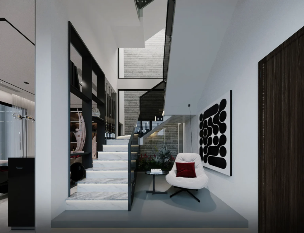 Cầu thang,phong cách hiện đại dạng thẳng đề cao tinh thần tối giản và tính tiện nghi của hạng mục. Thiết kế này loại bỏ các chi tiết rườm và sử dụng các đường thẳng mạnh mẽ để định hình cấu trúc tổng thể.