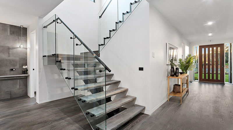 Thay vì lan can sắt hay gỗ đặc trưng, việc sử dụng kính cường lực cho các mẫu cầu thang hiện đại đã tạo nên cảm giác nhẹ nhàng, thanh thoát cho tổng thể. Chất liệu kính với đặc trưng trong suốt đã góp phần mở rộng tầm nhìn, đem đến cảm giác không gian rộng và sáng thoáng hơn.