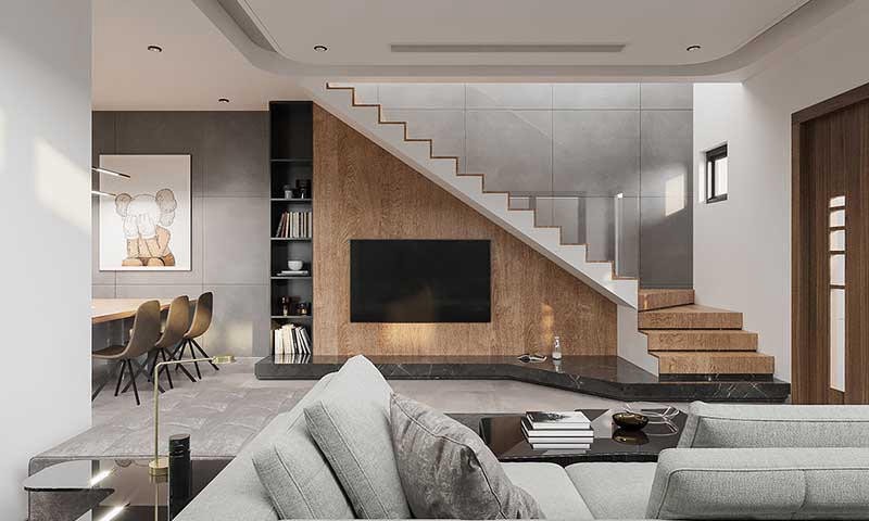 Ngoài ra, thiết kế chữ L còn giúp gia chủ tận dụng tối đa diện tích dưới gầm cầu thang. Gia chủ có thể sử dụng khoảng trống này để bố trí tiểu cảnh, cây xanh hoặc thiết kế thành kho chứa đồ của gia đình.
