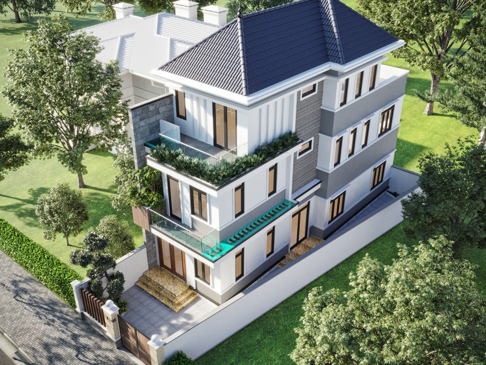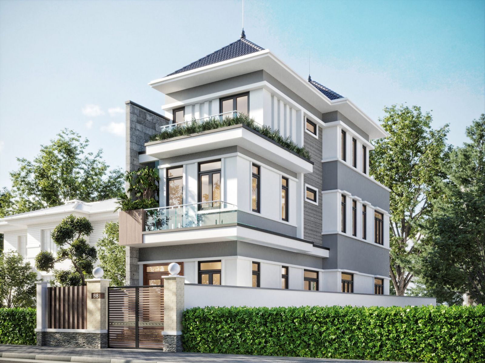 Phong cách: Hiện đại với các đường nét vuông vức, hình khối được xếp chồng một cách linh hoạt tạo nên các khoảng ban công và khoảng lùi hợp lý.Sử dụng kiểu mái Nhật (mái dốc nhẹ về các phía) màu xanh đen. Kiểu mái này mang lại vẻ thanh thoát và giúp điều hòa nhiệt độ tốt cho ngôi nhà.Tầng 2 và 3: Có các khoảng ban công rộng, sử dụng lan can kính cường lực giúp tối ưu hóa tầm nhìn và tạo cảm giác không gian mở, không bị gò bó.Sự kết hợp hài hòa giữa màu trắng sứ, xám ghi và các mảng nhấn từ gỗ nâu ấm.