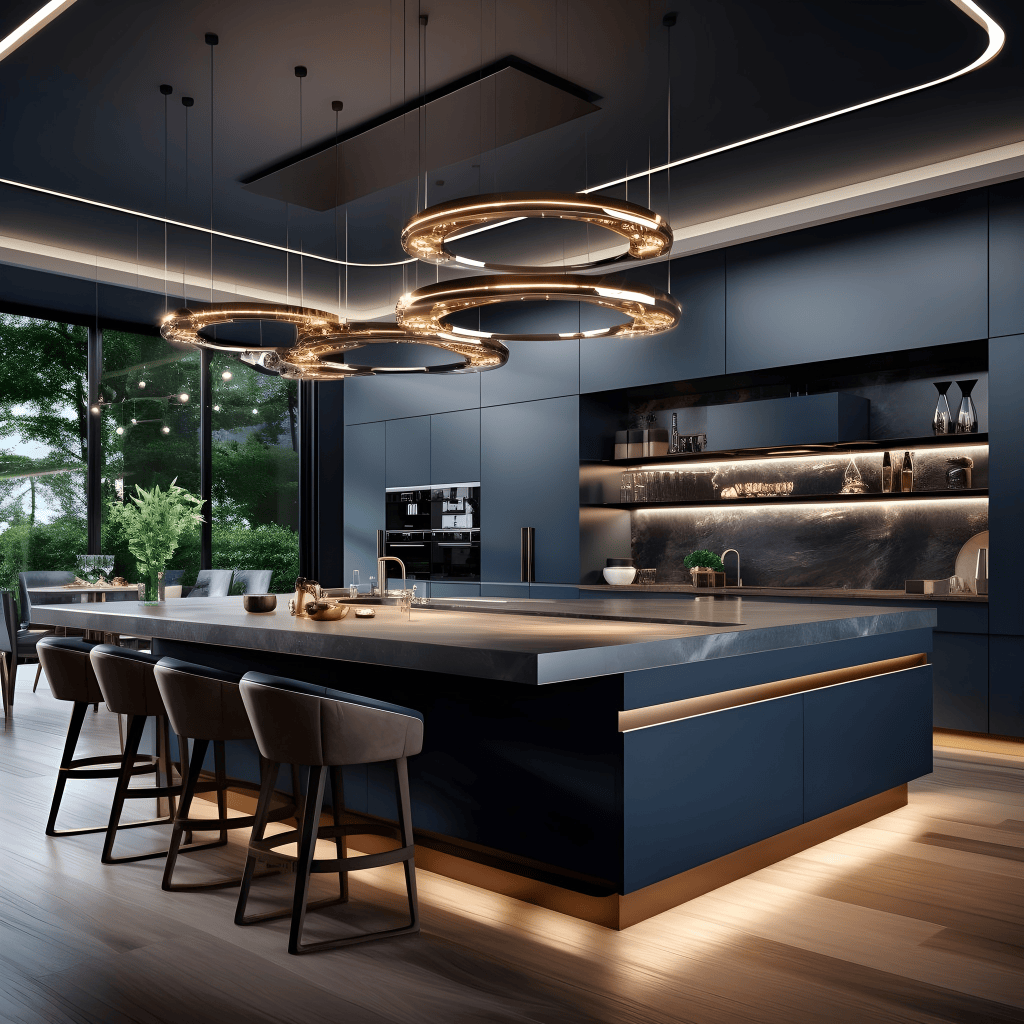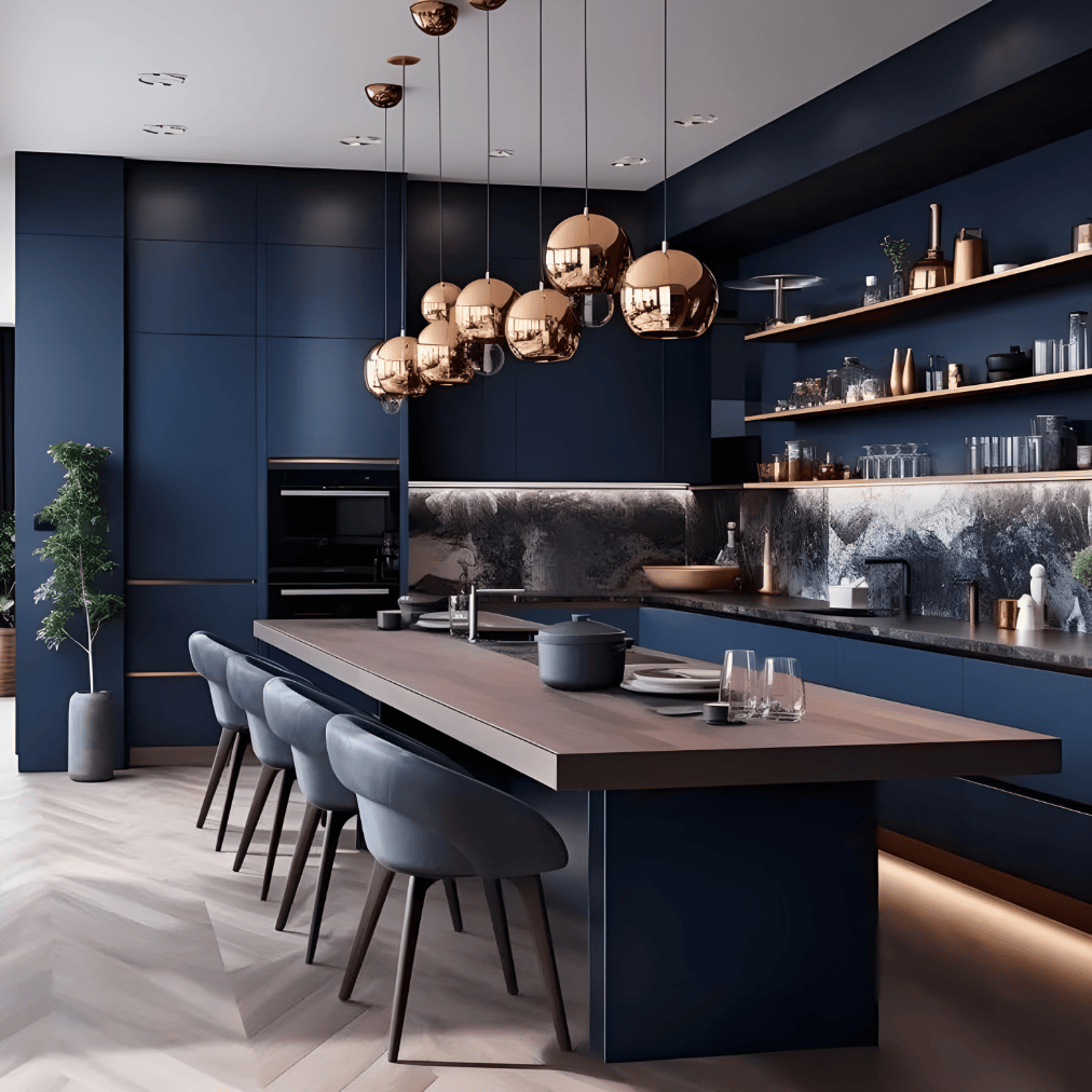 Bạn có thể sử dụng màu xanh da trời làm màu chủ đạo cho tủ bếp, mảng tường để tạo điểm nhấn thanh lịch. Khi kết hợp cùng tông trắng hoặc ánh sáng vàng nhẹ, toàn bộ không gian sẽ trở nên rộng rãi và đầy sức sống. Phòng bếp màu xanh da trời đặc biệt phù hợp cho những căn biệt thự theo phong cách Coastal, Tropical hoặc Scandinavian.