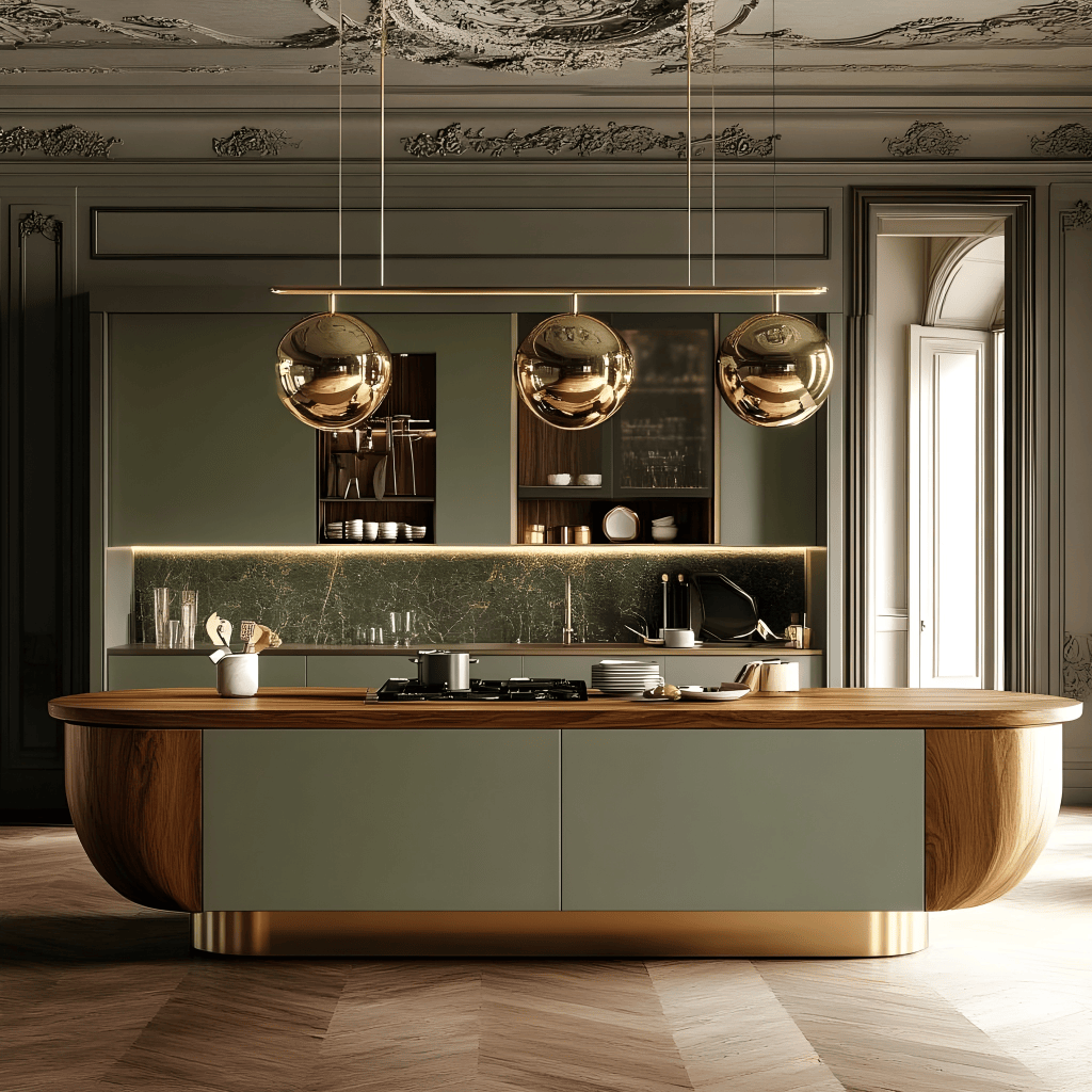 Xanh cổ vịt (Mallard Green) được cho là gam màu mang nhiều chiều sâu và cá tính nhất, rất phù hợp với những không gian phong bếp biệt thự cao cấp, đòi hỏi sự khác biệt. Ở các không gian này, thường được kết hợp với vật liệu như mặt đá marble vân mây, gỗ tự nhiên sẫm màu hoặc ánh kim (đồng, vàng xước). Nhờ sự tối ưu trong bố trí, khéo léo trong lựa chọn vật liệu và kết hợp với ánh sáng, bếp màu xanh cổ vịt tạo điểm nhấn mạnh mẽ về thị giác, gợi cảm giác đẳng cấp cho tổng thể.