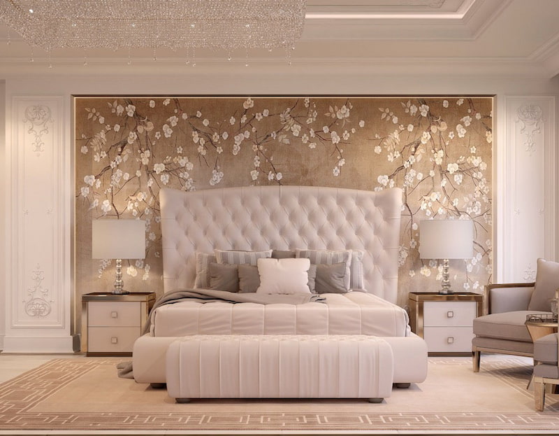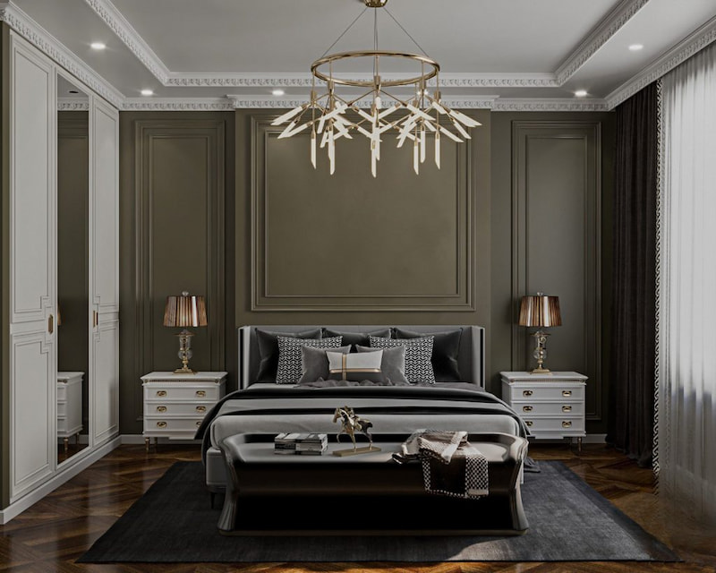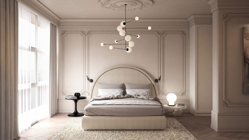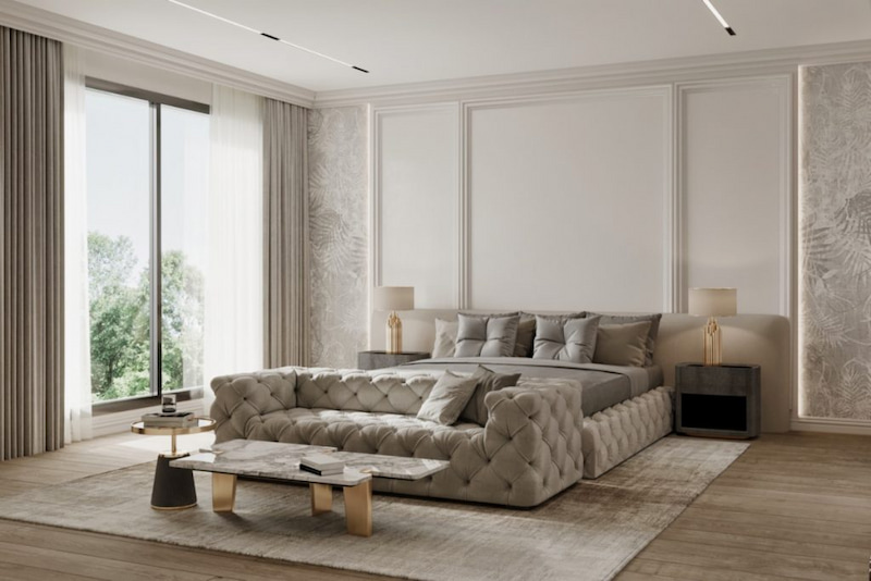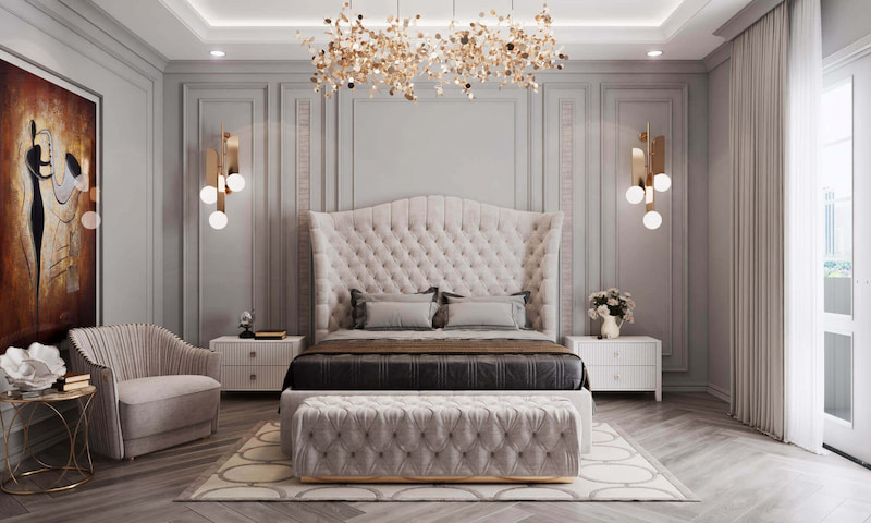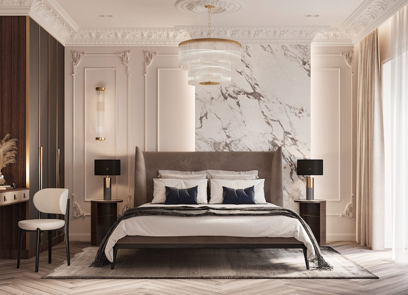 Lấy cảm hứng từ kiến trúc Châu Âu tráng lệ, phòng ngủ tân cổ điển mang phong cách Châu Âu thường sử dụng những họa tiết cầu kỳ, giường bọc nệm sang trọng, đèn chùm pha lê lấp lánh điểm nhấn sắc vàng hoặc bạc, tạo cảm giác như một cung điện thu nhỏ.