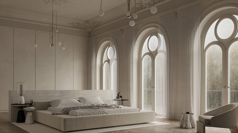 Phòng ngủ tân cổ điển với kiến trúc vòm độc đáo và tông màu trung tính, mang lại cảm giác rộng rãi và cổ điển như không gian châu Âu