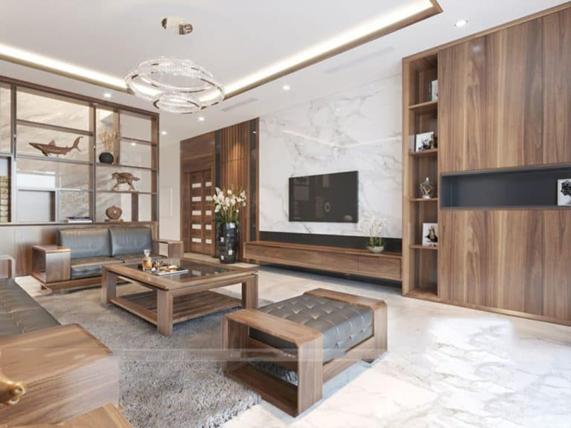 Ngắm nhìn không gian phòng khách nhà phố hiện đại với chất liệu chính là gỗ óc chó