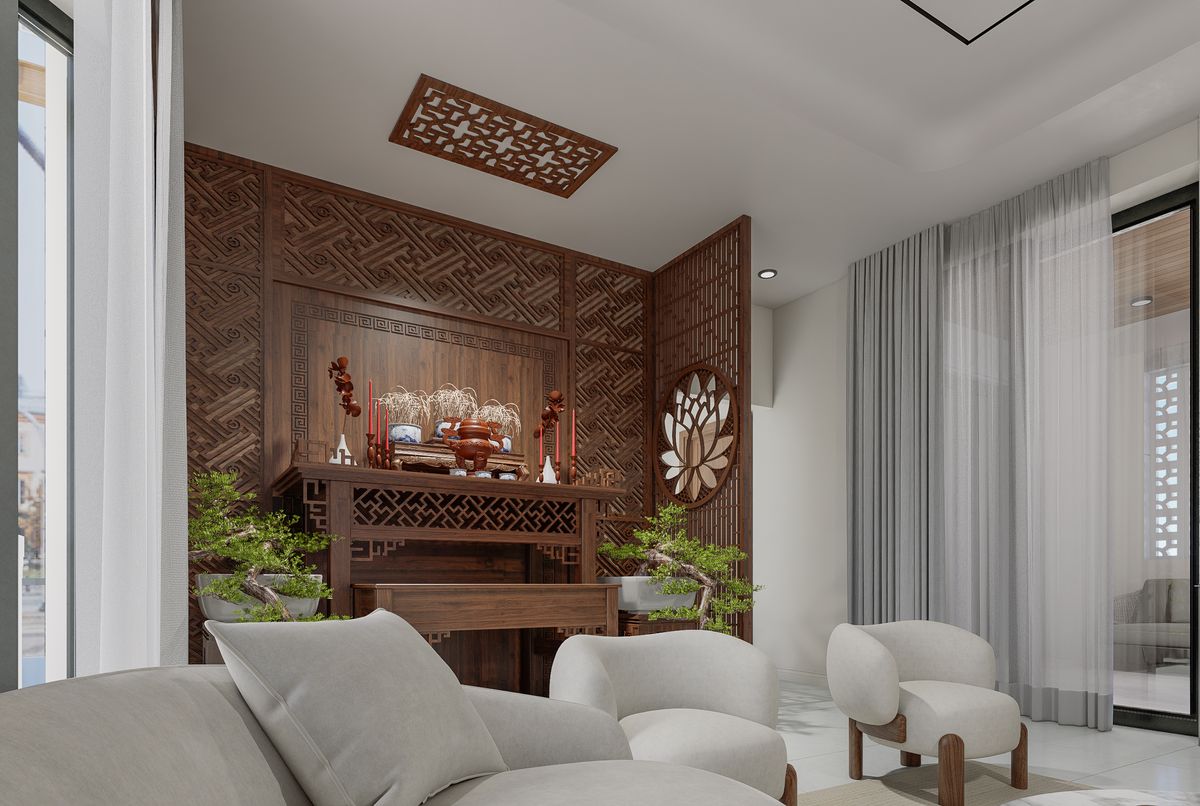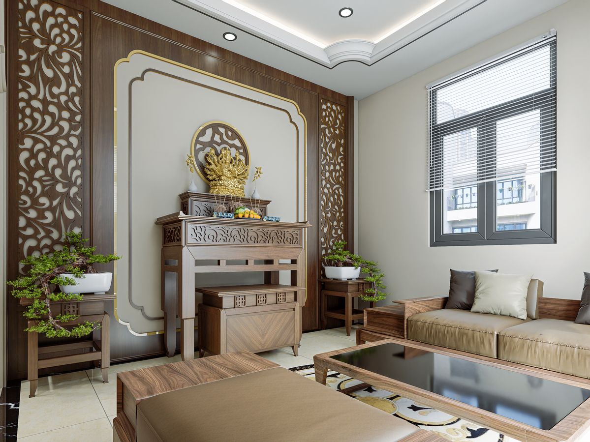 Đây là giải pháp được sử dụng phổ biến trong nhà phố và nhà ống nơi phòng khách thường liên thông với các khu vực sinh hoạt khác. Tủ thờ được đặt sát tường, phía sau bố trí vách ngăn CNC hoặc lam gỗ để tạo sự phân tách tương đối, mang lại cảm giác riêng tư cho khu vực thờ cúng.