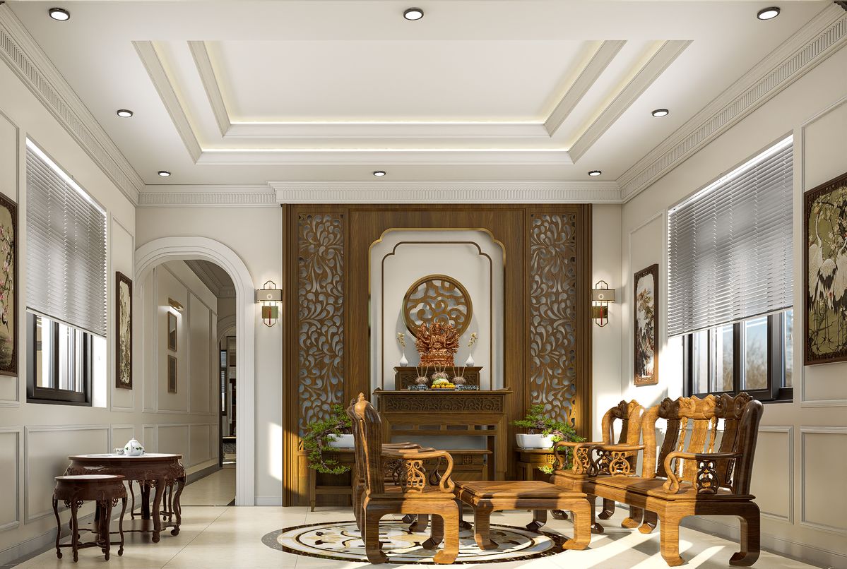 Phong cách tân cổ điển phù hợp với các công trình có diện tích lớn như biệt thự hoặc nhà phố quy mô rộng. Khu vực thờ cúng thường sử dụng tủ thờ kích thước lớn bằng gỗ tự nhiên, được chạm khắc tinh xảo, kết hợp cùng các chi tiết truyền thống như hoành phi, câu đối, lư đồng hay đèn dầu.