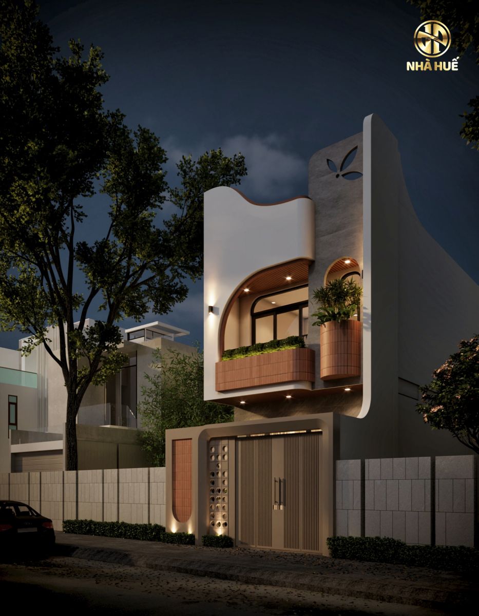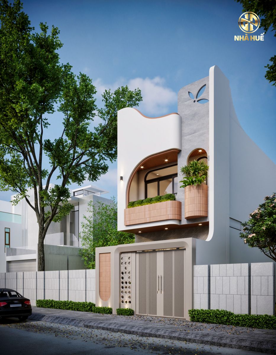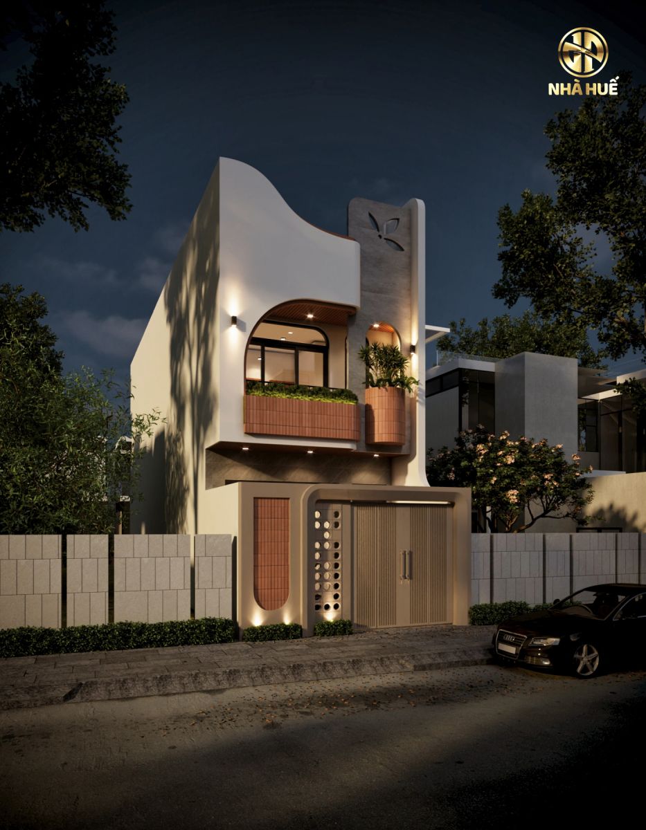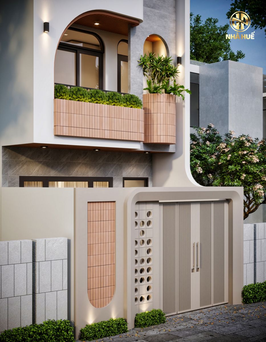 Cổng và Hàng rào: Cổng nhà có thiết kế rất sáng tạo và đồng bộ với kiến trúc tổng thể. Cánh cổng màu trắng kem được chia làm hai phần: một bên là các nan sọc dọc và một bên là một tấm đặc được trang trí bằng các lỗ tròn. Cổng được bao bọc bởi một khung tường bo cong mềm mại, có lắp đèn hắt sáng từ dưới lên. Hàng rào được xây bằng các khối bê tông lớn màu xám, xen kẽ là một mảng tường ốp gạch hồng đất tương tự như ở ban công.Thiết kế sử dụng đa dạng vật liệu hiện đại như bê tông, gạch ốp tường vân đá (ở tầng trệt), gạch thẻ trang trí, kim loại sơn tĩnh điện và kính. Dọc chân tường và cổng được trồng các bụi cây cảnh nhỏ. Phía sau có thể thấy cây cối xanh tươi, cho thấy ngôi nhà có sân vườn hoặc nằm trong khu vực nhiều cây xanh.