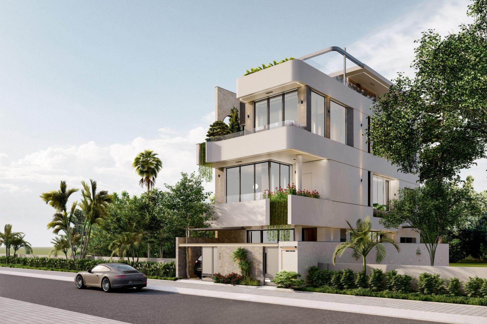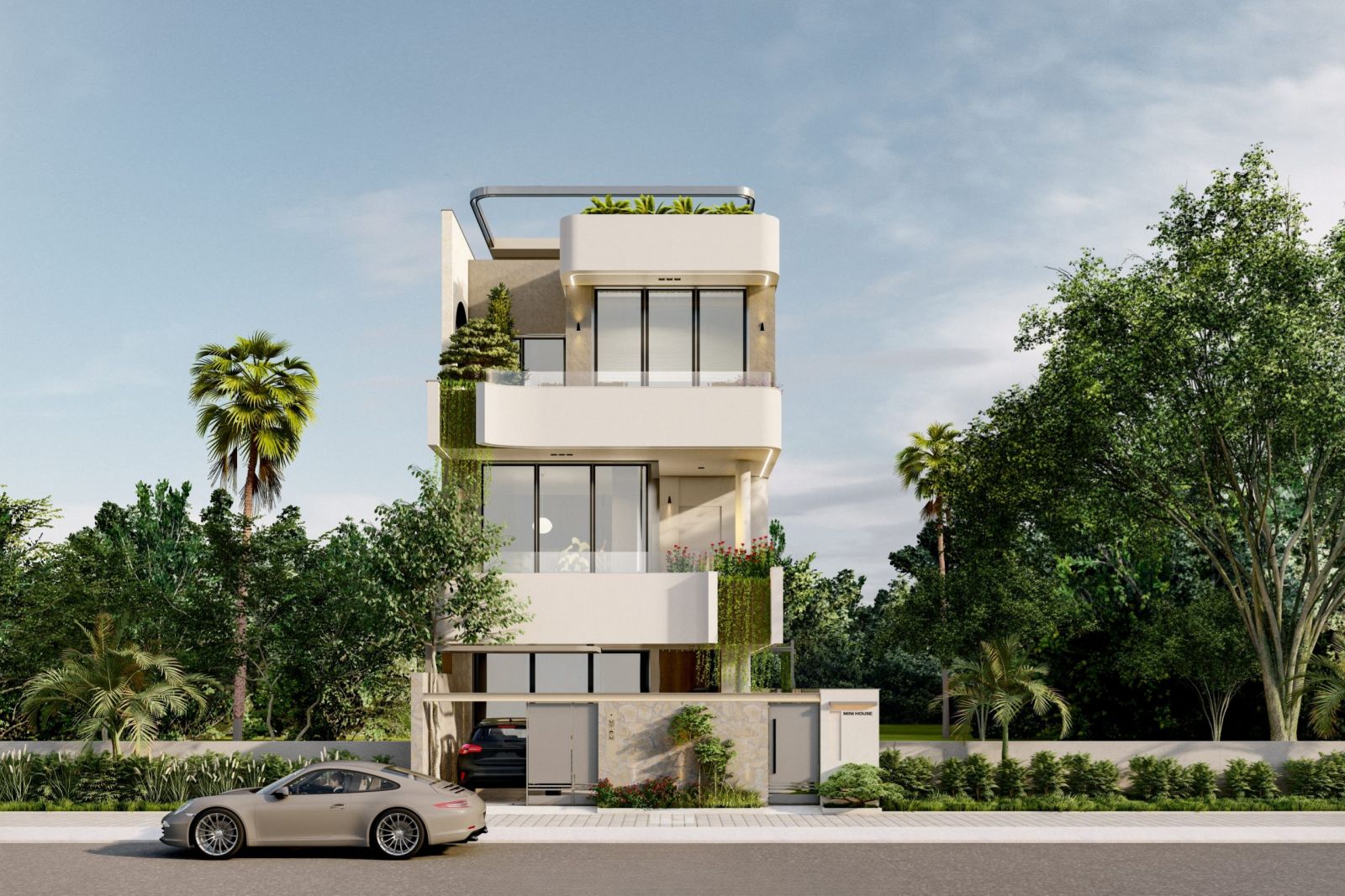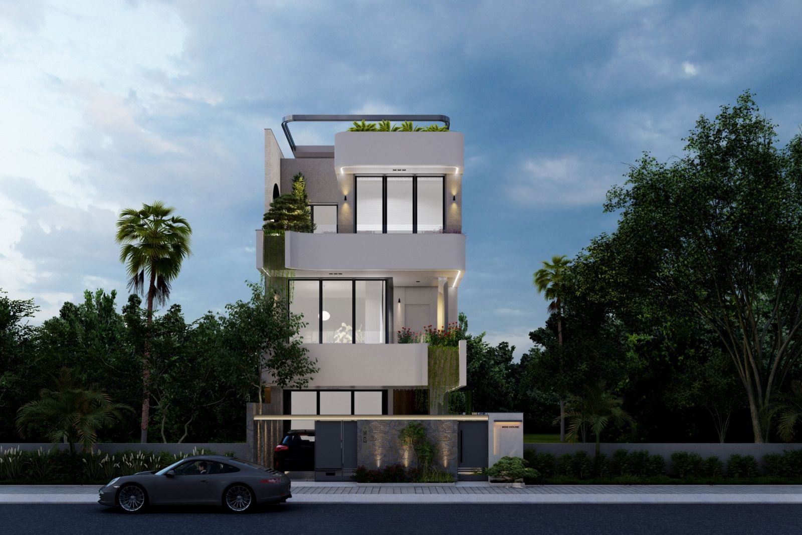 Tầng trệt: Được thiết kế lùi vào một chút so với các tầng trên. Bên trái là gara ô tô, bên phải là lối vào chính được bảo vệ bởi một hệ thống cổng và tường rào kiên cố nhưng vẫn thẩm mỹ với các mảng cây xanh nhỏ.