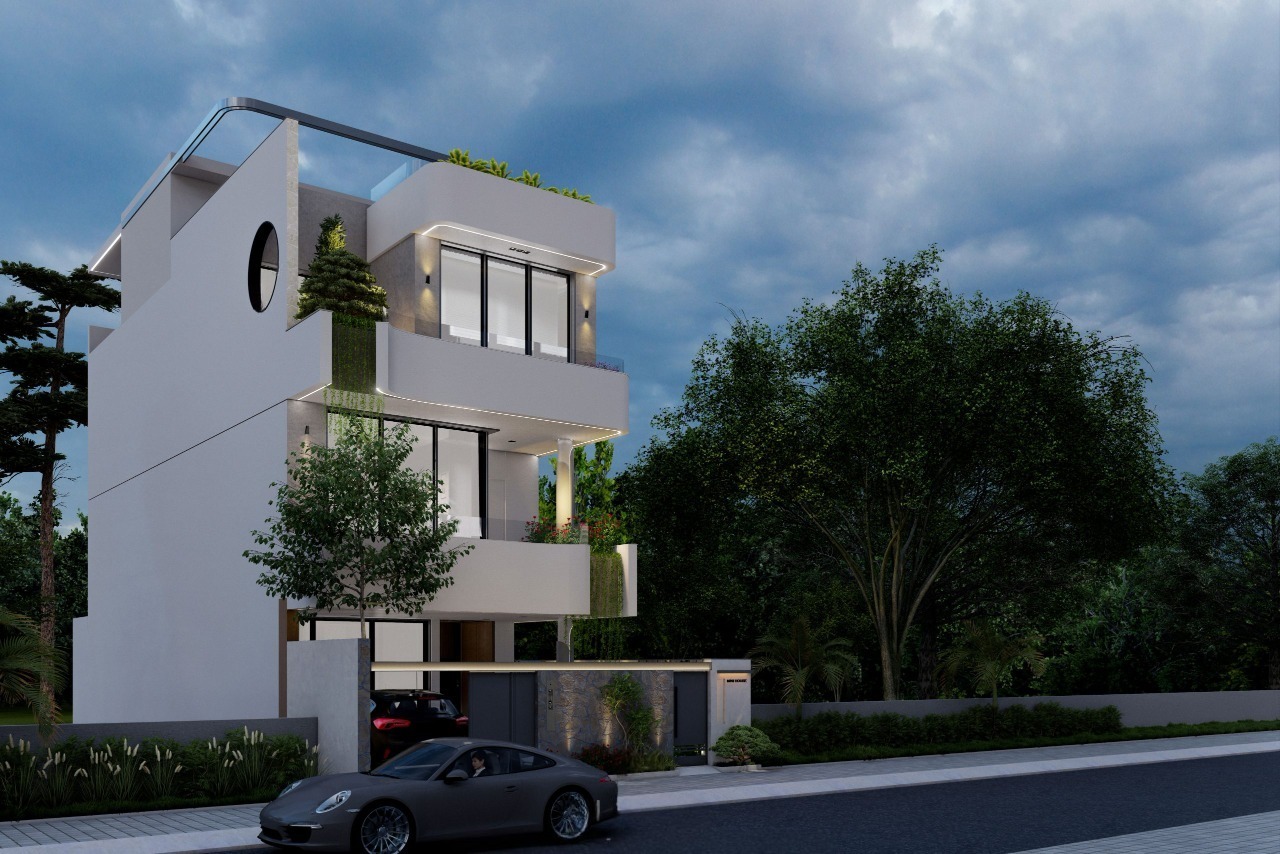 phối cảnh buổi tối mang lại một cảm giác riêng tư, yên tĩnh và sang trọng. Công trình nổi bật như một tác phẩm điêu khắc ánh sáng giữa không gian đêm.Ánh sáng vàng ấm tỏa ra từ bên trong và từ hệ thống đèn ngoại thất tạo ra một không khí ấm cúng, thân mật và chào đón.Ánh sáng không được bố trí ngẫu nhiên mà được dùng để nhấn mạnh các đường nét, hình khối đặc trưng của ngôi nhà. Các đèn downlight âm trần trên ban công chiếu sáng xuống, làm nổi bật các đường cong mềm mại và tạo ra chiều sâu cho không gian.Bức tường đá của hàng rào được chiếu hắt sáng từ dưới lên, tôn lên vẻ đẹp của vật liệu. Cây cối trong sân cũng được chiếu sáng nhẹ nhàng.Lan can kính trên sân thượng được viền bằng một dải đèn LED tinh tế, tạo ra một đường sáng ngang đầy phong cách, khẳng định sự hiện đại và đẳng cấp của công trình.