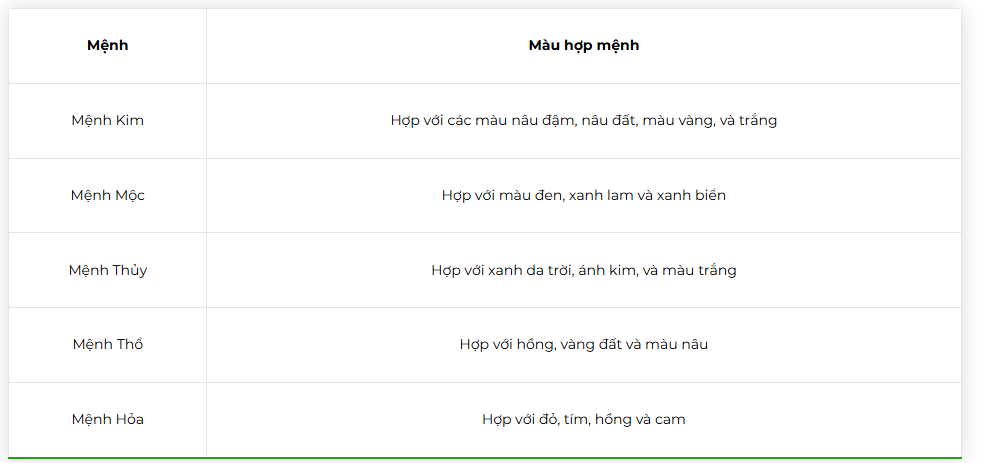 Sai lầm tiếp theo của những gia chủ khi sửa nhà chính là lựa chọn màu sơn không phù hợp với phong thủy. Việc dùng màu sơn không đúng hoặc màu kỵ với phong thủy tuổi của chủ nhà có thể khiến cuộc sống gia chủ gặp nhiều khó khăn. Dưới đây là màu sơn tương sinh với từng bản mệnh mà gia chủ có thể tham khảo: