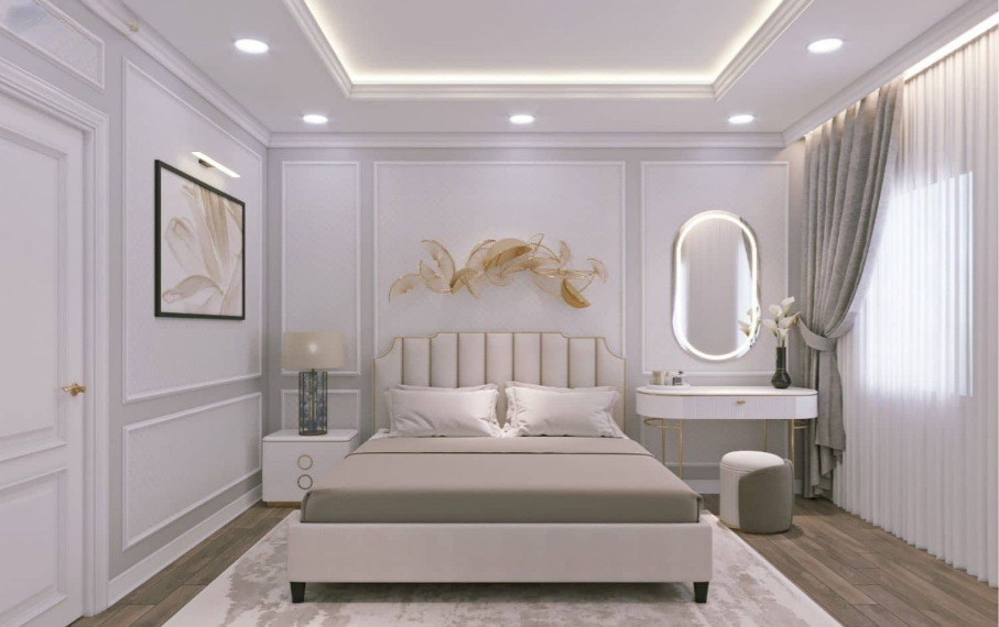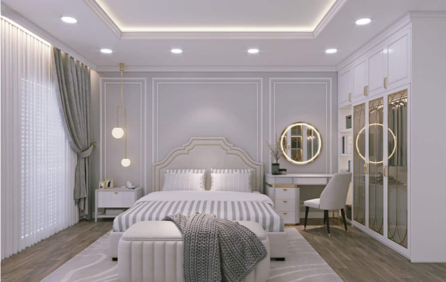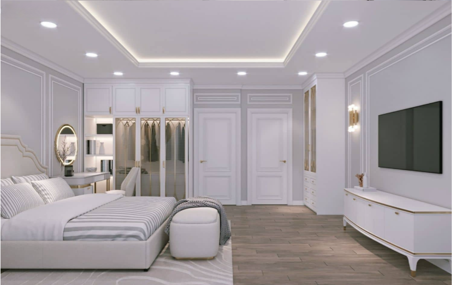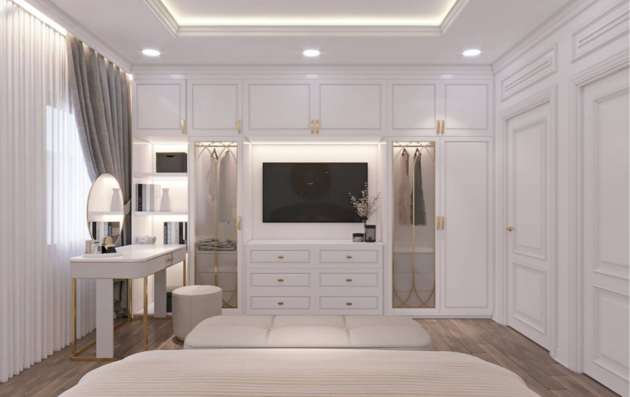 Màu trắng được sử dụng làm màu chủ đạo cho toàn bộ hệ tủ, tường và trần nhà, tạo cảm giác không gian rộng rãi, sạch sẽ và sáng sủa. Các chi tiết màu vàng đồng (gold) từ tay nắm tủ, chân bàn trang điểm và các họa tiết trang trí tạo điểm nhấn sang trọng và ấm áp.