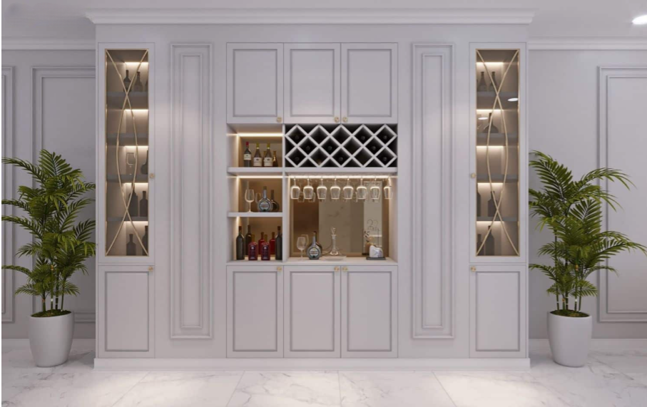 Tủ rượu âm tường được thiết kế riêng với hệ thống đèn LED chiếu sáng và ô kệ phân chia khoa học, mang lại cảm giác sang trọng như một quầy bar thu nhỏ ngay tại nhà.